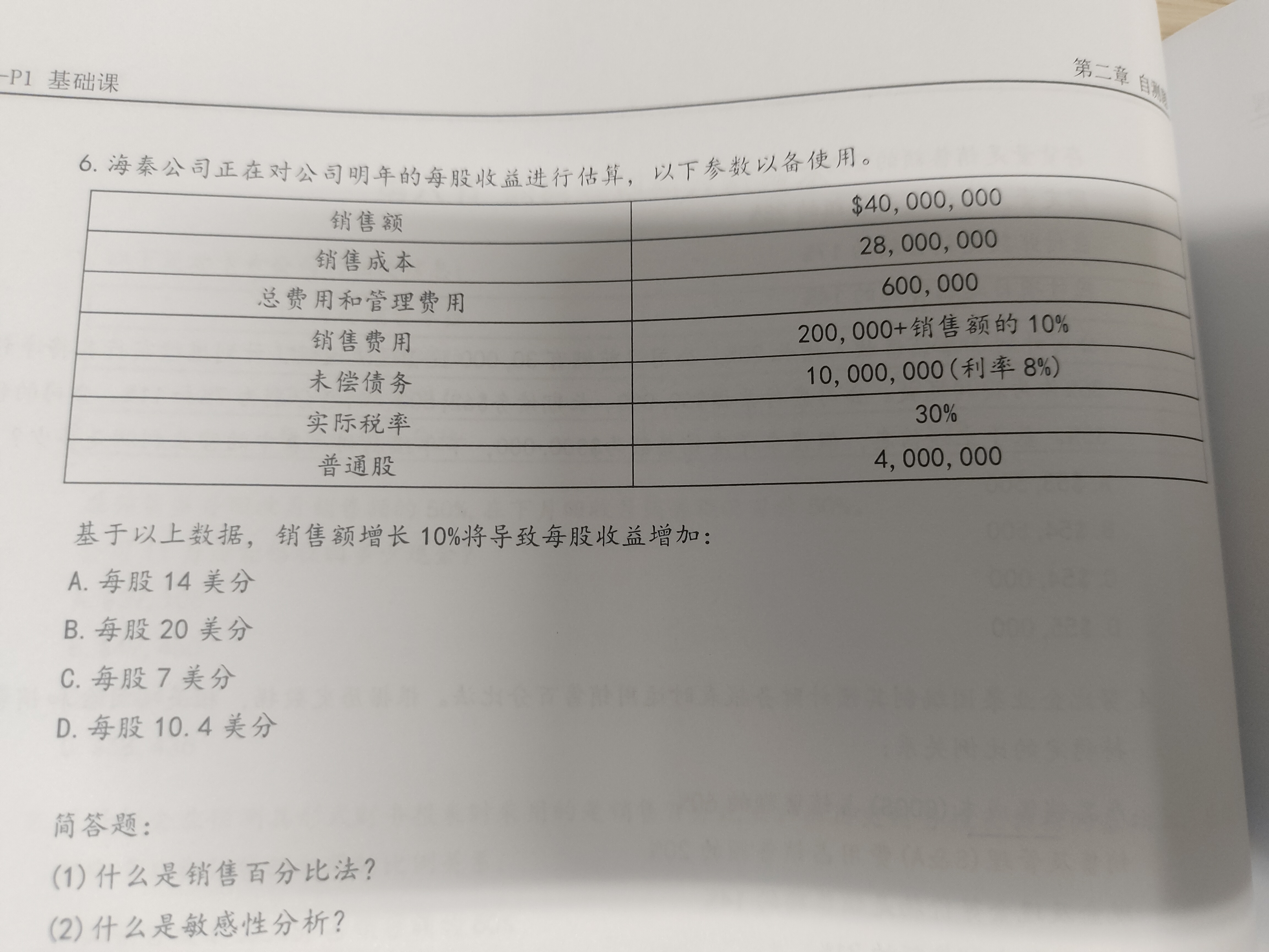 同学你好,EPS =(净利润−优先股股息)/加权平均普通股股数。按照现在数据计算,净利润=(40000000-28000000-600000-200000-(40000000×10%)-(10000000×8%))×(1-30%)=4480000。普通股股数为400000,所以EPS=1.12。销售额增加10%以后,销售额=40000000×(1+10%)=44000000。销货成本=44000000×70%=30800000。,所以净利润=(44000000-30800000-600000-200000-(44000000×10%)-800000)×(1-30%)=5040000。因为股数为4000000,所以EPS=5040000/4000000=1.26。1.26-1.12=0.14,所以选择14美分。
