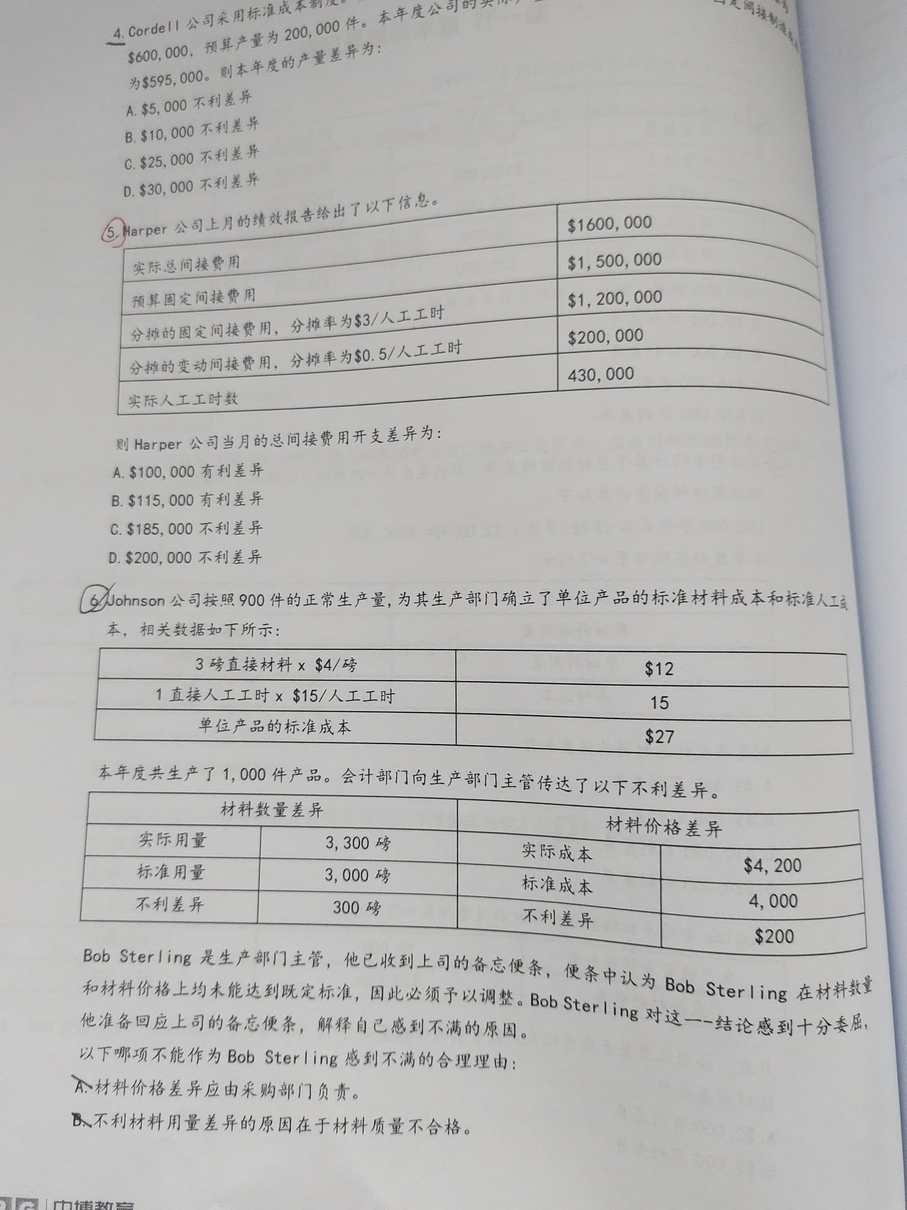 【第六题】生产差异(成本差异、开支差异和效率差异)都基于实际生产数量而产生。这和常规产量、生产能力、预计产能、预计生产数量,计划生产、期望生产数量以及其他用来衡量生产情况的指标都没有关系。因此,实际生产数量和其他生产指标之间的差异是不太相关的。