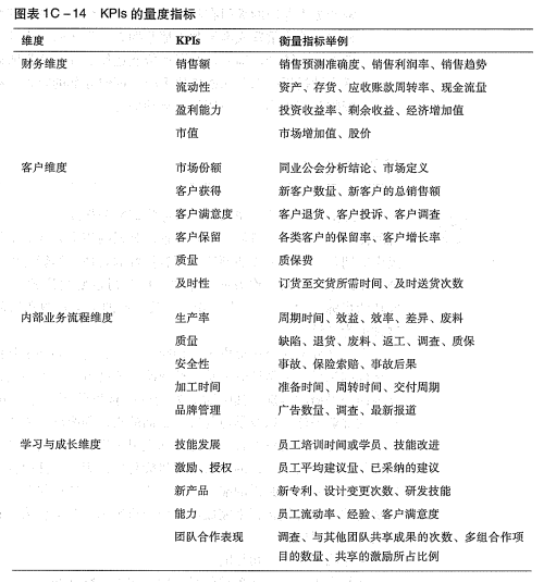 下图是平衡记分卡的关键绩效指标,从财务指标上看,比如投资收益率、剩余价值都是利于短期快速发展。评估客户、内部业务流程以及学生和成长这三个方面是非财务指标。其中客户指标有一个因果关系链:客户满意度、客户保留、市场份额、客户获得、客户满意度,这些可以更好的服务于客户,从客户身上盈利,利于长期发展。在获得客户满意度的时候,比如对员工能力的培训,从财务角度看,是一项成本支出,如果管理层只看到是成本的财务指标,很可能就会减少这部分支出,但这部分支出从长远来看,是值得的,所以需要非财务指标来对财务指标进行配合。
