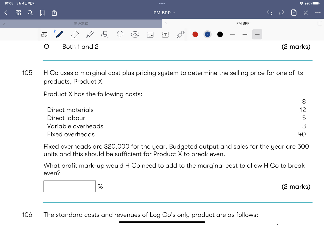同学,盈亏平衡点FC=contrinbution,20000=500*(SP-(12+5+3)),得出SP=60,定价方法又是MC加成,MC=20,(60-20)/20*100%=200%就是mark up的百分比。