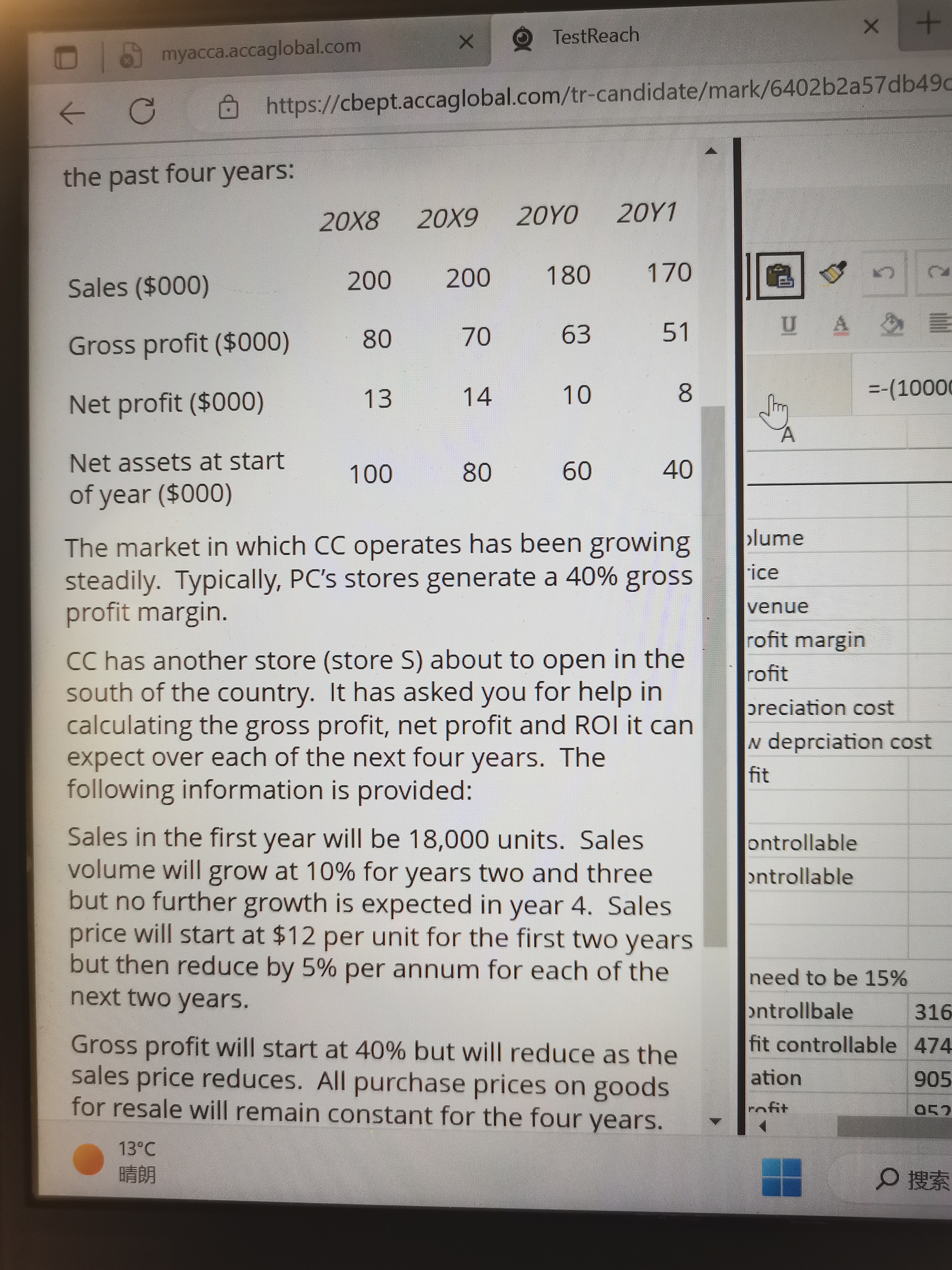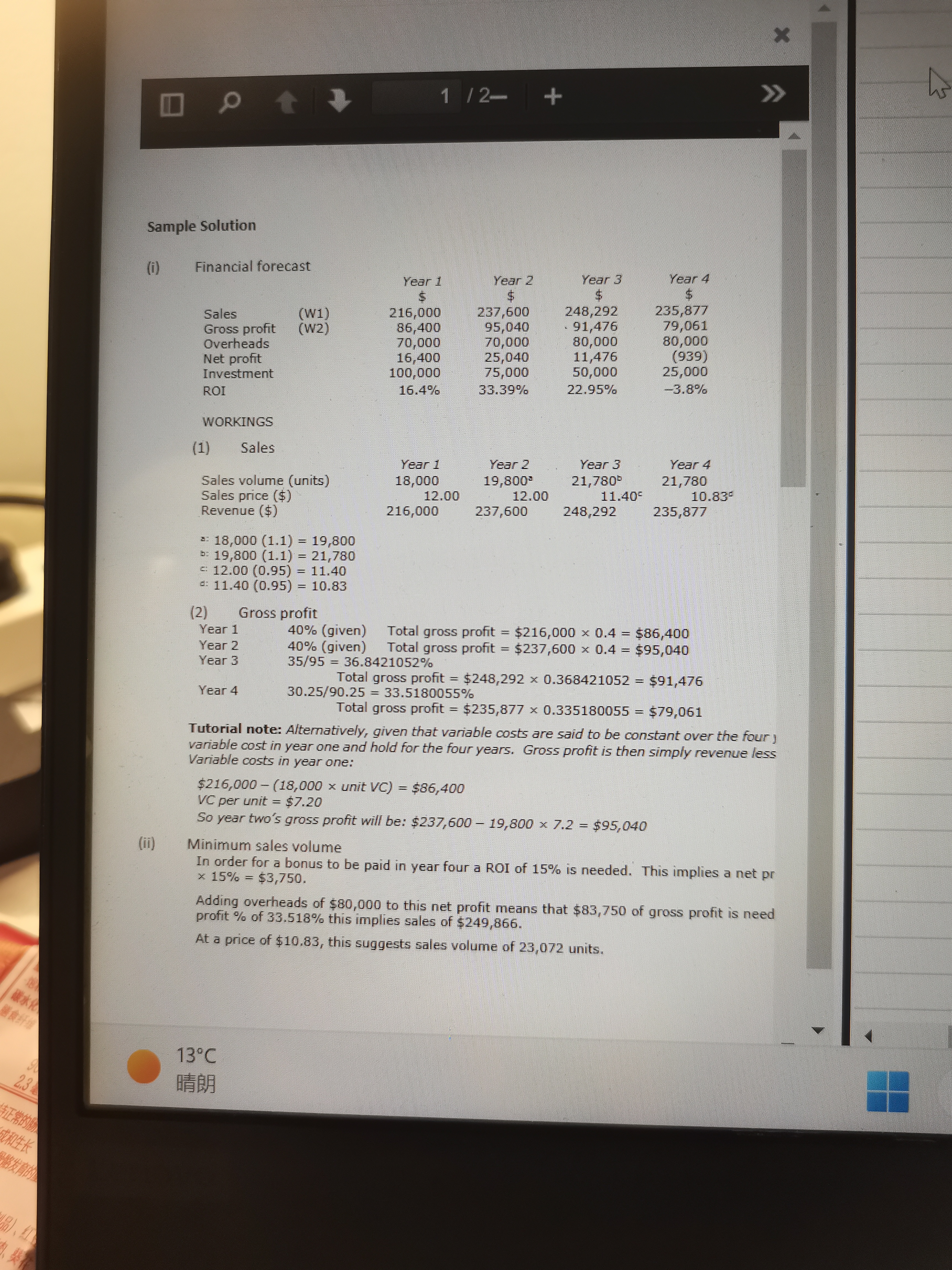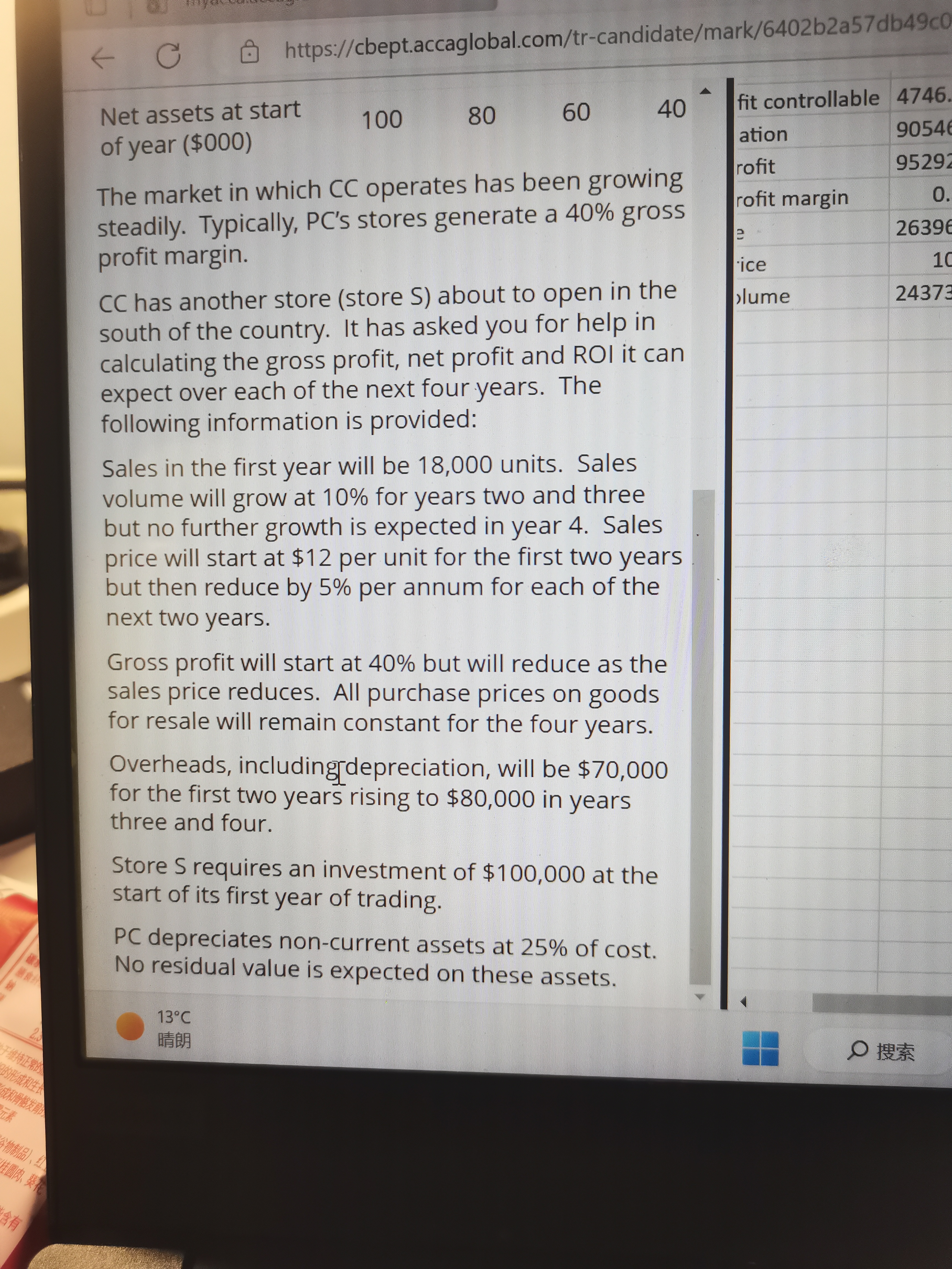 同学,题干描述gross profit 开始是40%,但是后面降低是因为销售价格的降低,销售价格是前两年一样12,后面每年降低5%,假设gross profit 40,sales100,那么sales后两年降低100*(1-5%)=95,100*(1-5%)^2=90.25,同样的比例gross profit 就是40-5=35,40-9.75=30.25。按比例再求出margin。