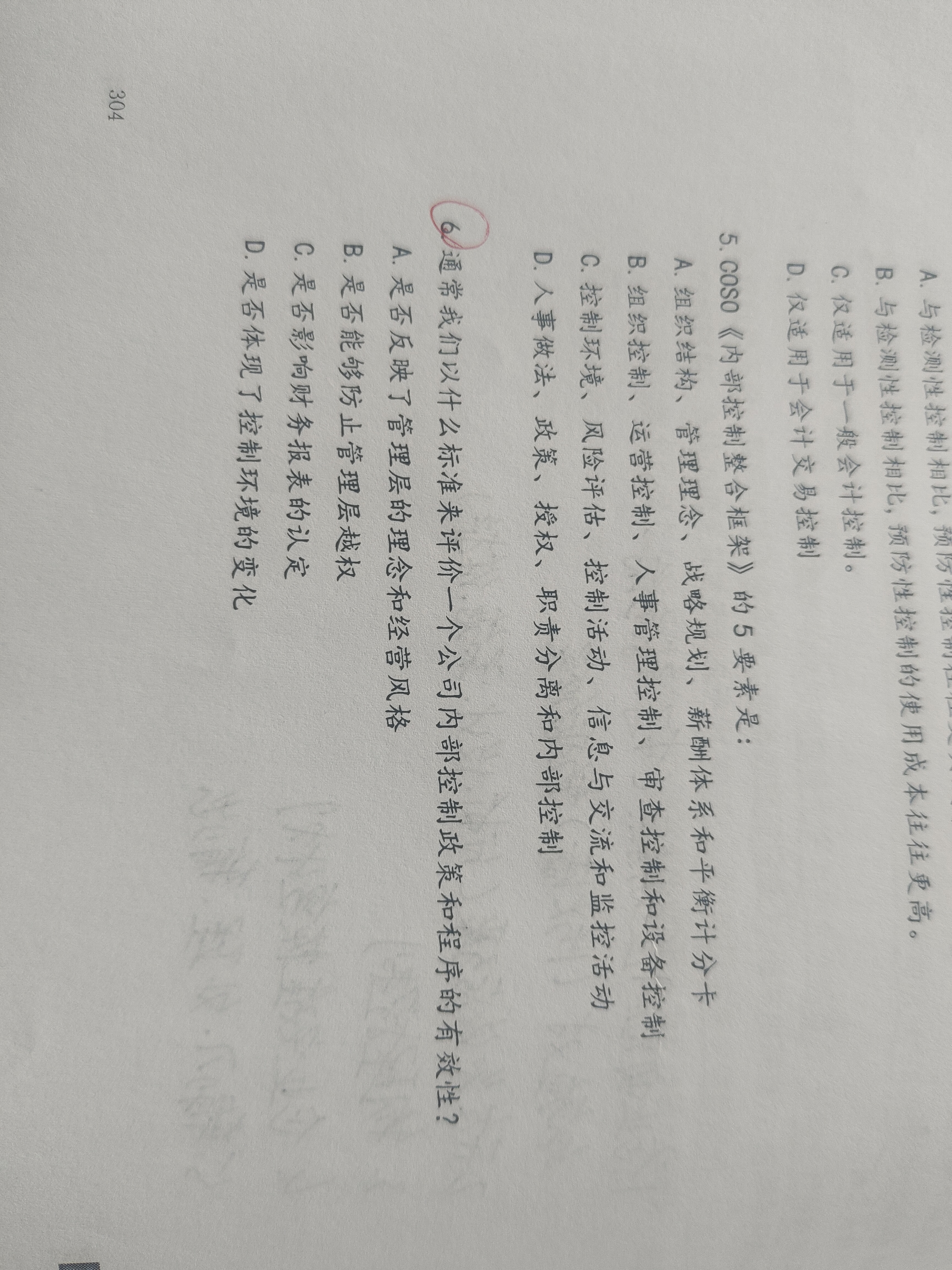 内部控制有效性是指企业建立与实施内部控制对实现控制目标提供合理保证的程度,包括内部控制设计的有效性和内部控制运行的有效性。D选项体现的就是内部控制设计的有效性。A选项:管理层的理念属于控制环境的一种,这种控制环境可以影响内部控制运行,但不能反过来说内部控制有效性直接体现管理层理念,而是体现在是否与当时的组织结构合适,是否按照内部控制制度正常运行。