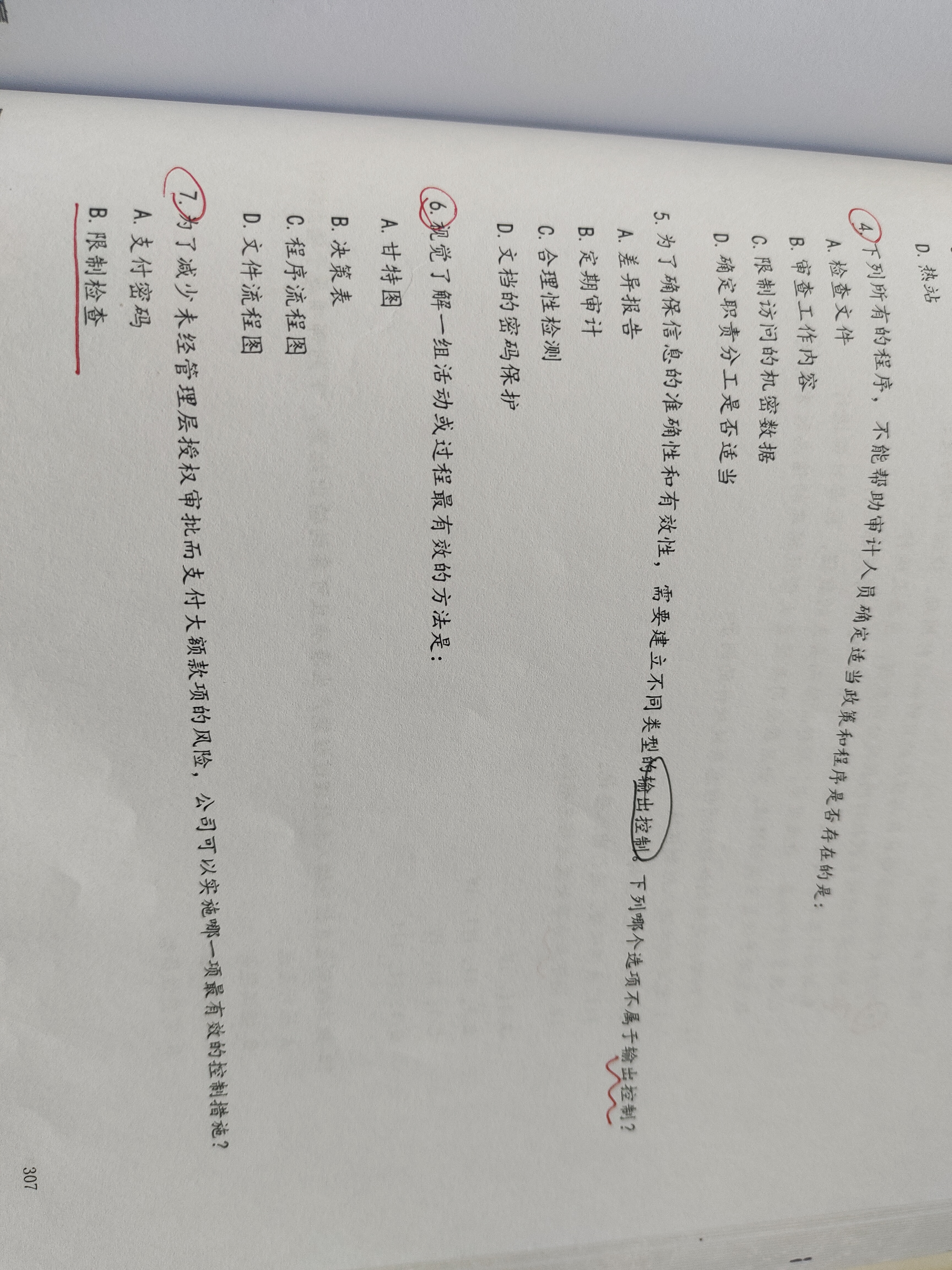 【第四题】限制访问的机密数据,审计人员接触不到,那就帮不到审计人员。【第七题】限制检查可以限制处理没有具体管理授权的最大金额票据,就是在超出自己权限范围内的金额必须上报,自己没有处理权限。兼容性检验是验证系统使用者执行在线交易是否经过授权的最有效控制。它验证用户访问信息,比如用户名、密码和安全配置文件是否正确。
