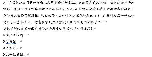 【第六题】系统流程图是指在一个系统中确定整体和主要的运营流向,说明输入的产出、输入的次序、处理模式及输出的形式或内容。程序流程图:主要是甶系统开发人员使用,与系统流程图类似,更关注详细的处理功能。而文件流程图:用于列出应用系统中所使用的所有文档并确定这些文档组织、分步和最终处置的控制点。文件流程图形象化地展示了文件(如送货单复印件)在不同部门间的流转,是一种有效方法。我觉得这道题目不严谨,如下图铺垫了很久文件流转的直接选D没问题。