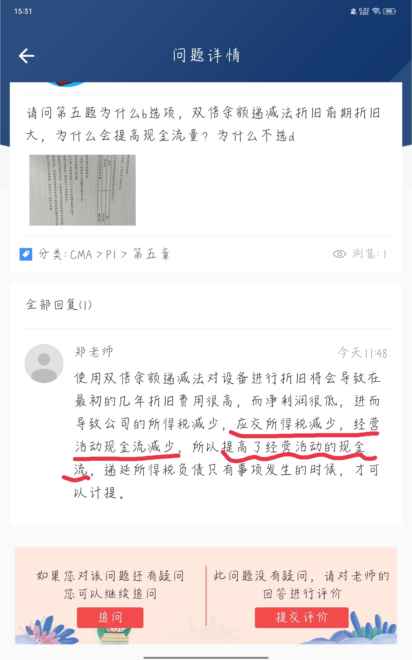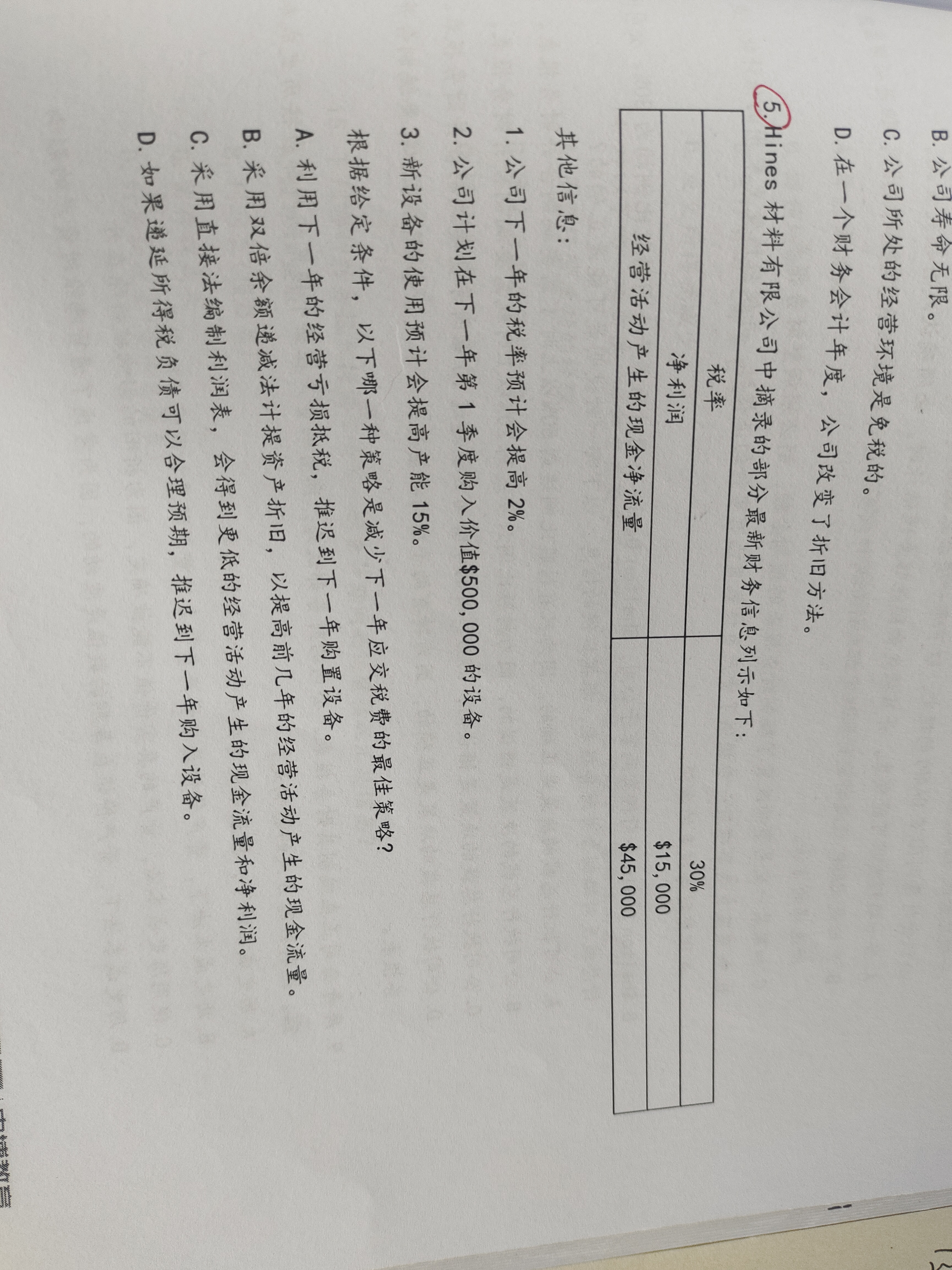 使用双倍余额递减法对设备进行折旧将会导致在最初的几年折旧费用很高,而净利润很低,进而导致公司的所得税减少,应交所得税减少,经营活动现金流减少,所以提高了经营活动的现金流。递延所得税负债只有事项发生的时候,才可以计提。
