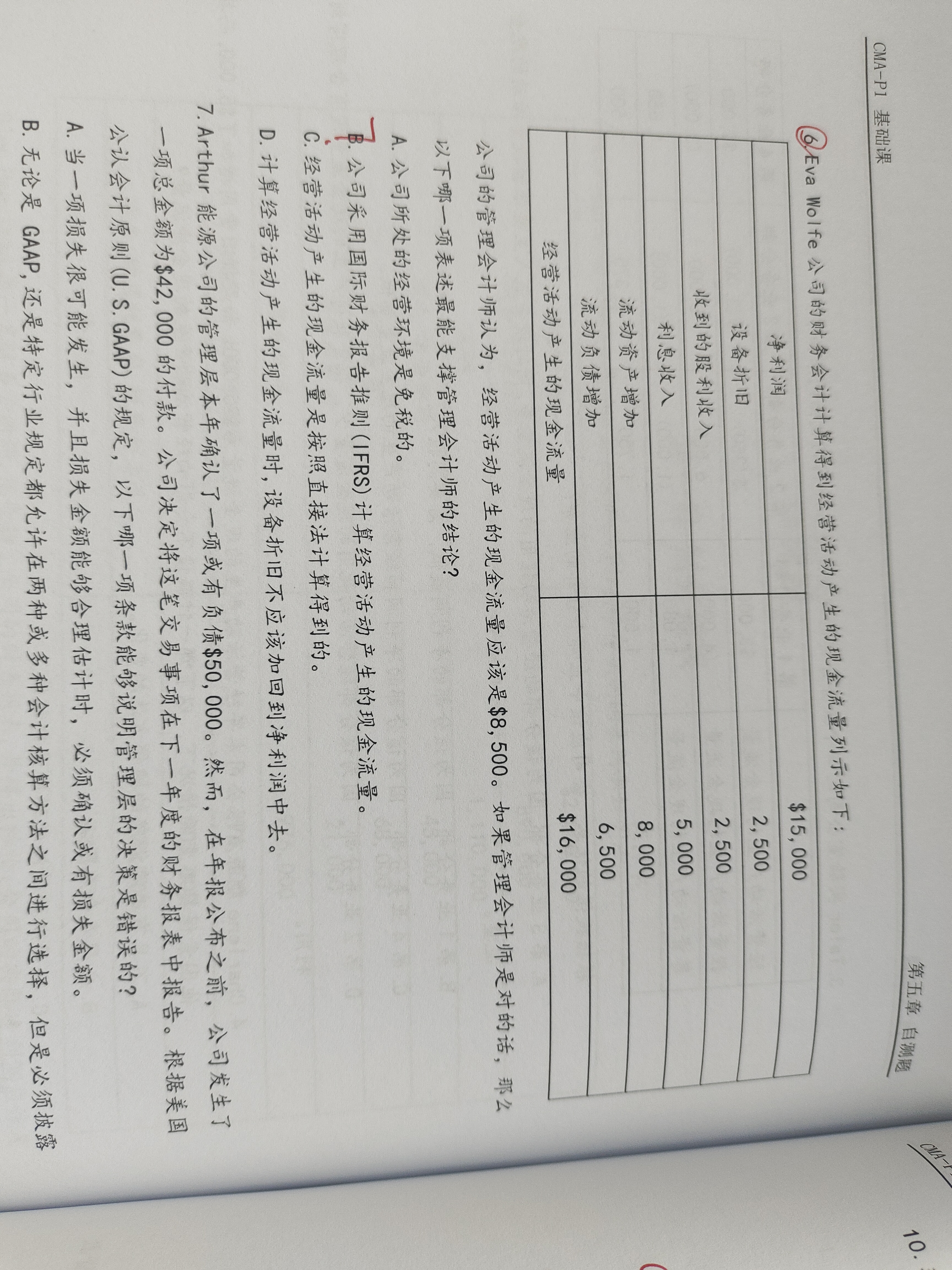 管理会计师基于国际财务报告准则IFRS对经营活动所产生的现金流进行确认,他未将股利收入和利息收入计入经营活动的现金流量中。国际财务报告准则对于股利收入和利息收入的分类十分灵活,既可以计入经营活动中,也可以计入融资活动当中。因此,他计算的经营活动现金流量=15000美元+2500美元-(8000美元-6500美元)-(2500美元+5000美元)=8500美元