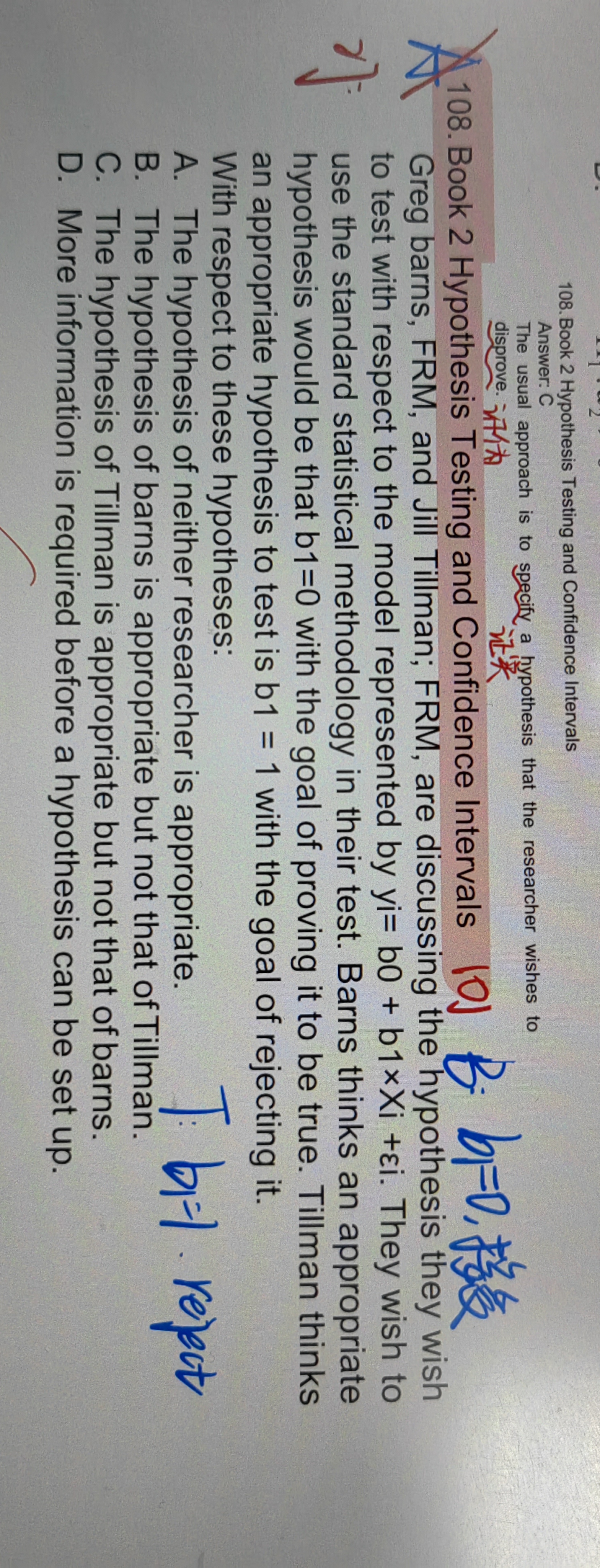 同学你好,答案是C没错,我们在做检验回归系数b1是否显著的时候,一般情况下是指回归系数是否显著等于0,但是也是可以检验其是否显著等于某个具体数值(比如这里的1)。