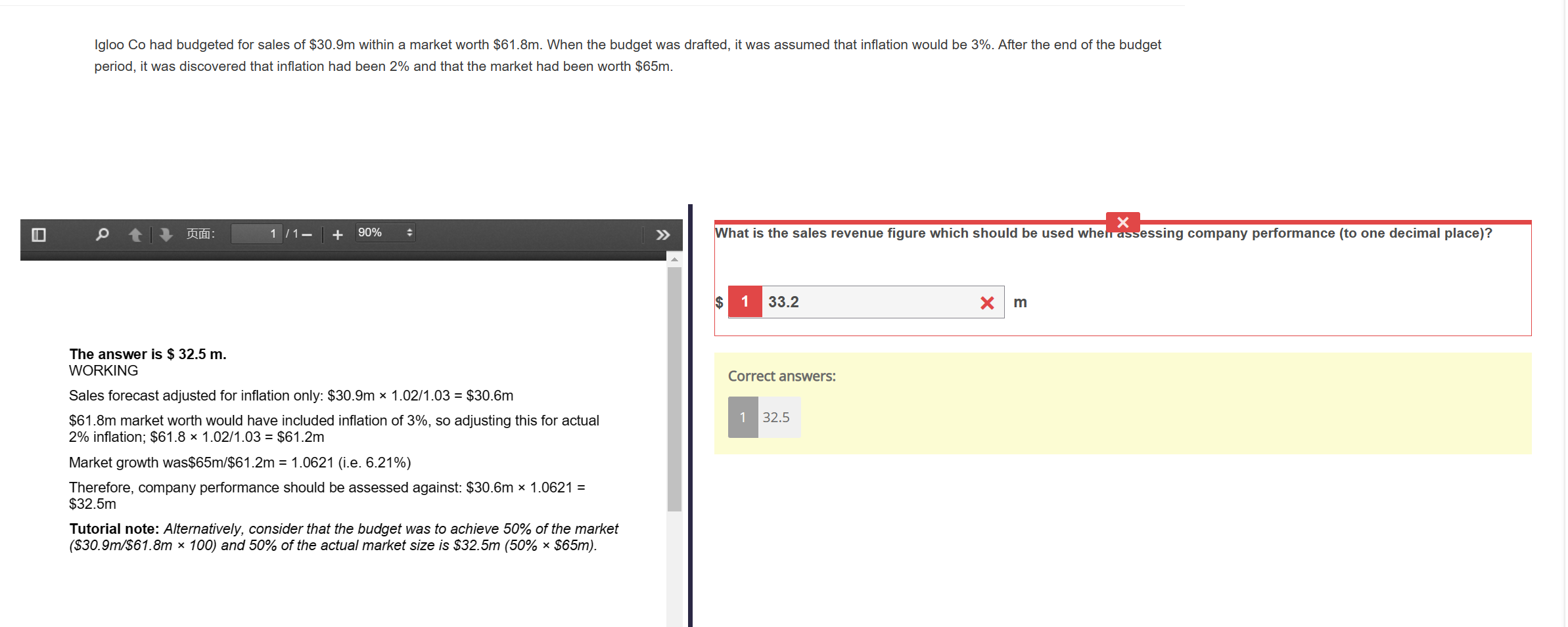 同学,题干描述,公司当年做预算的时候是市场为61.8m的时候sales应该是30.9m,并且当时认为通货膨胀应该是3%,但是实际上通货膨胀是2%,市场为65m,现在如果按照修订的数据来算,sales应该是多少。首先要计算出将通货膨胀的影响去掉的sales,即30.9*1.02/1.03,然后是计算出将通货膨胀的影响去掉的market61.8m*1.02/1.03,然后计算市场的增长率是65m/61.2m=1.0621,那么sales就应该同步增长,30.6m*1.0621=32.5。
