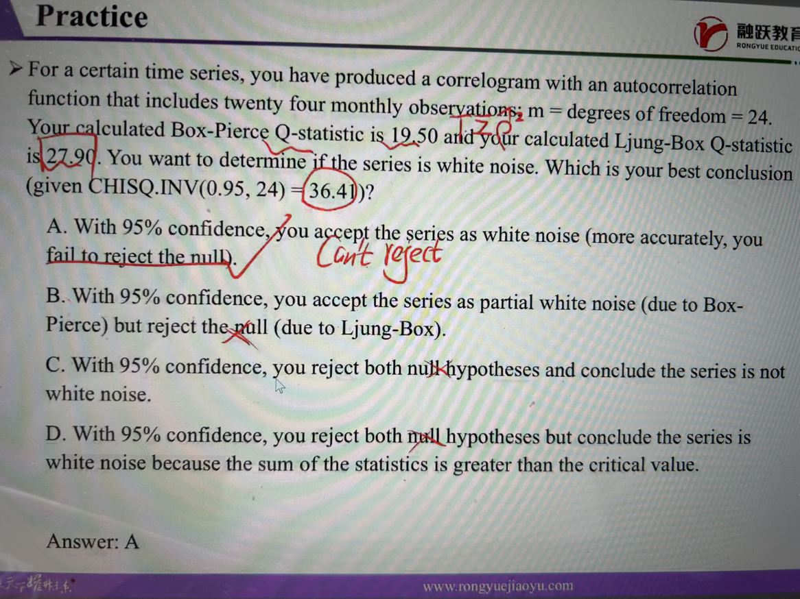 同学你好,因为相比BPQ而言,LBPQ更加适合小样本,题干中给出自由度是24,说明是小样本,所以用LBPQ更加合理,但是这道题BPQ和LBPQ检验统计量的值都小于计算出来的关键值,所以都不能拒绝原假设。