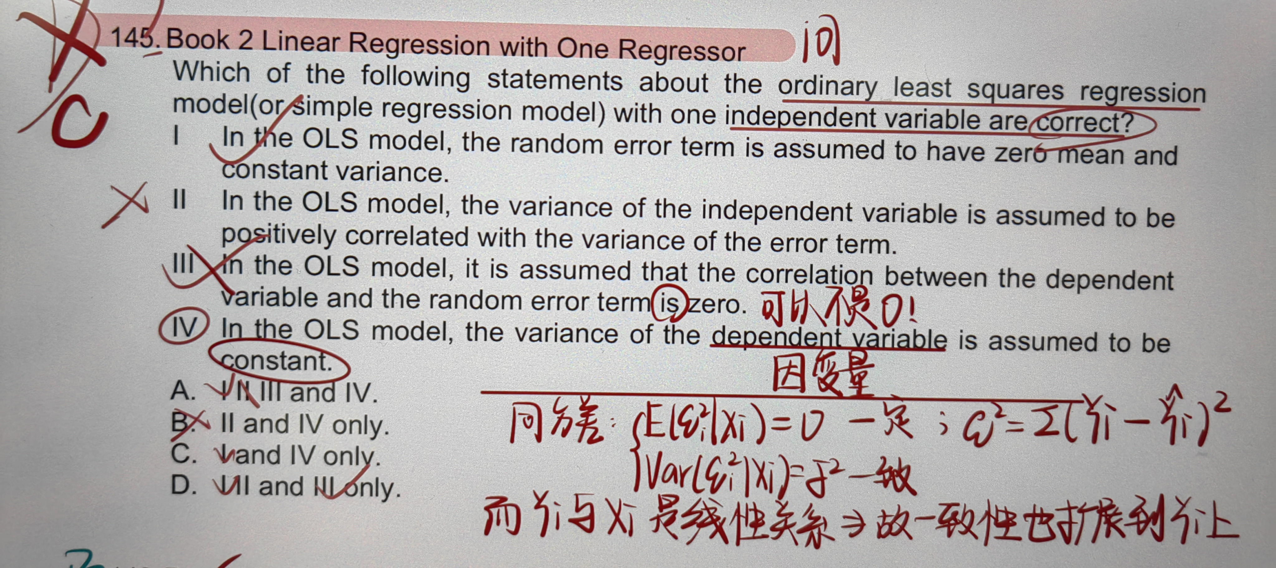 同学你好,第四个说法是有误,应该是In the OLS model, the variance of the error term is assumed to be constant。
