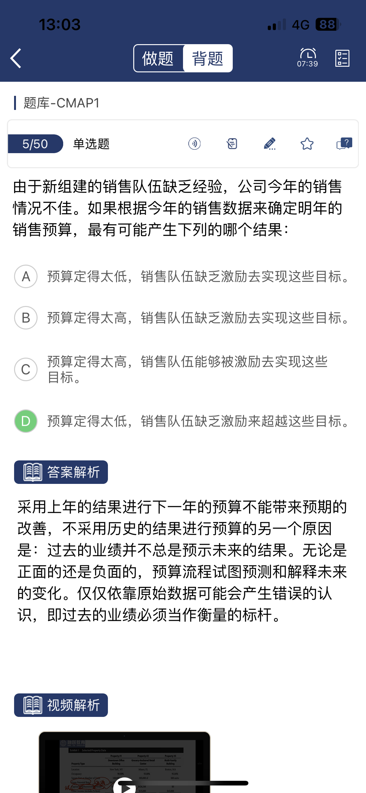 同学你好,首先我们假设目标为G,A选项的意思是设置的这个目标可能都完不成,能完成的业绩小于G。D选项的意思是能完成G,但是也就仅仅刚能完成,不能激励他们完成大于G的业绩。