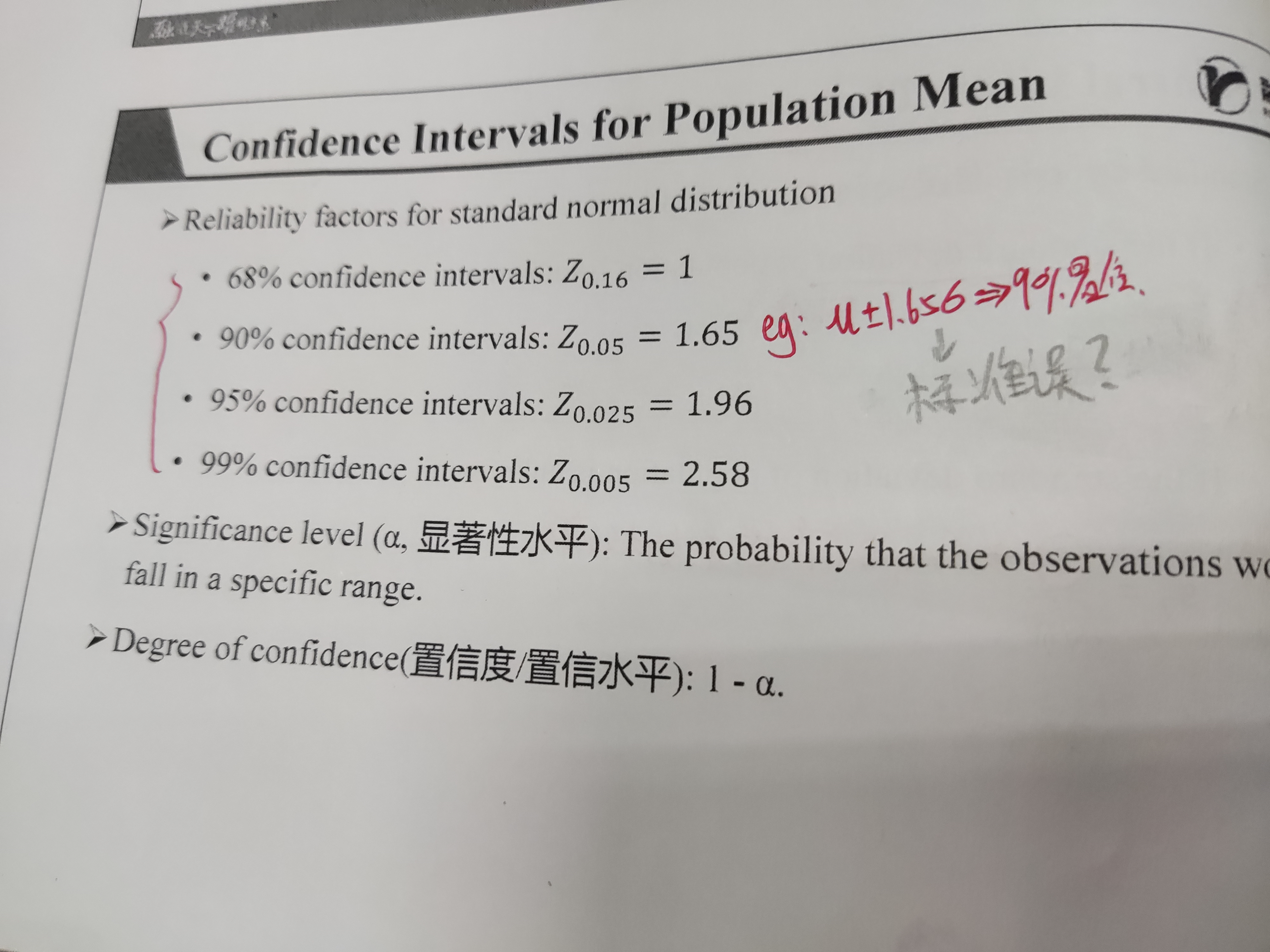 所谓样本均值的标准差,实际上就是标准误。如果总体的标准差知道,可以用第一个公式求,但是通常,总体的标准差我们是未知的,这个时候如果还要求标准误,我们可以先求出来样本的方差,然后利用点估计的思想,我们用样本的方差代替总体的方差,去计算最终的标准误。 1.65×σ,1.65代表的是关键值,σ代表标准差,二者结合代表偏离均值的水平