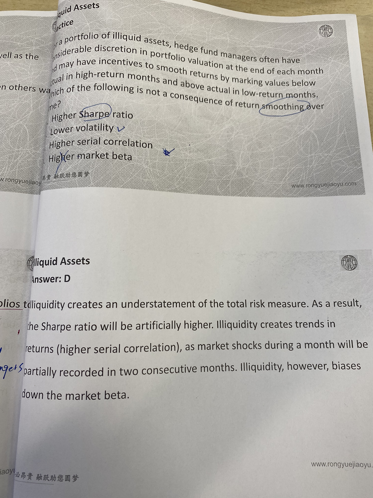 smoothing的结果,会导致自相关上升,但是会降低和其他资产之间的相关性。课件上描述的correlation lower,指的是非流动性资产和其他资产之间的相关性,如果我们关注的是自相关性,那么平滑会导致自相关的上升