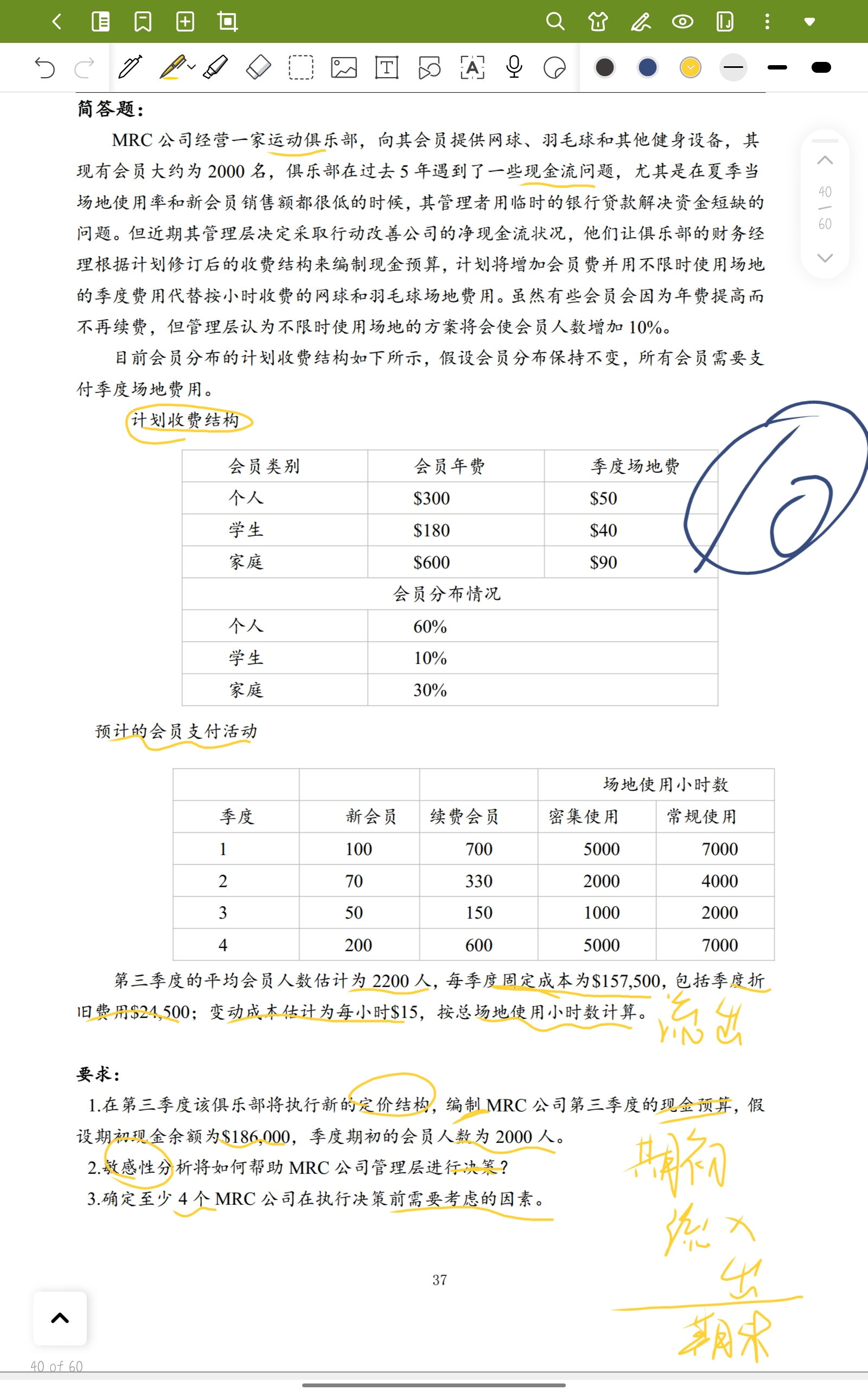 同学你好,(1)根据题目”计划将增加会员费并用不限时使用场地的季度费用代替按小时收费的网球和羽毛球场地费用“可知,收入分为两部分:会员费+季度场地费,所以计算现金流入的时候需要计算场地费。(2)再根据题目”假设会员分布保持不变,所有会员需要支付季度场地费用“,”季度期初的会员人数为2000人“,期初会员人数是2000人,第三季度交会员费的人员增加10%=2000×10%=200,其中50人是新客户,150是老客户。所以在计算场地费的时候,新用户是50人,续交会员费的150人老客户是含在期初会员人数2000人里面的。也就是说有150人的老客户在第三季度既续交了下一年的会员年费,又需要交下个季度的场地费。