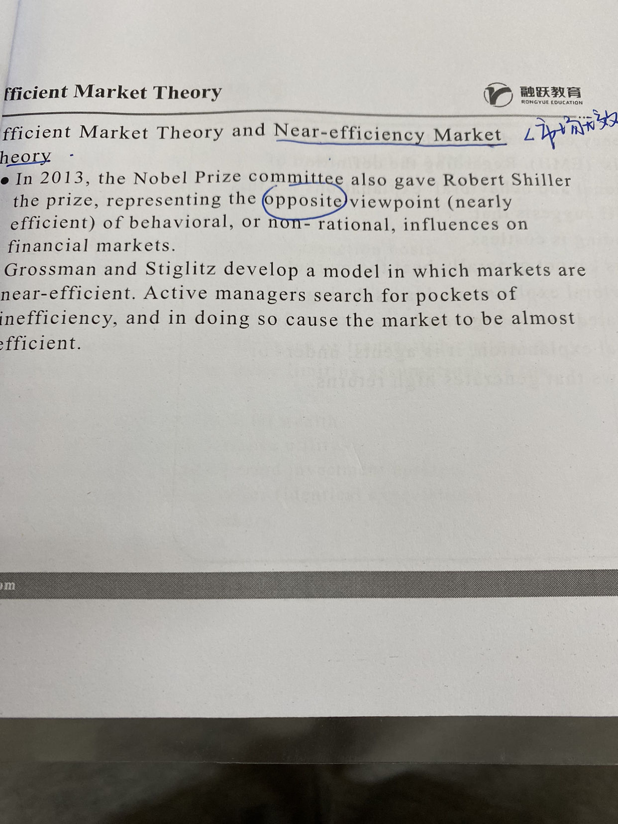 同学你好,Robert Shiller的观点和有效市场相反,即承认市场并非完全有效,而是存在着非理性的情况,类似于金融行为学的观点,因此,在这样非完全有效的市场中是会存在超额回报的,了解大概意思即可。