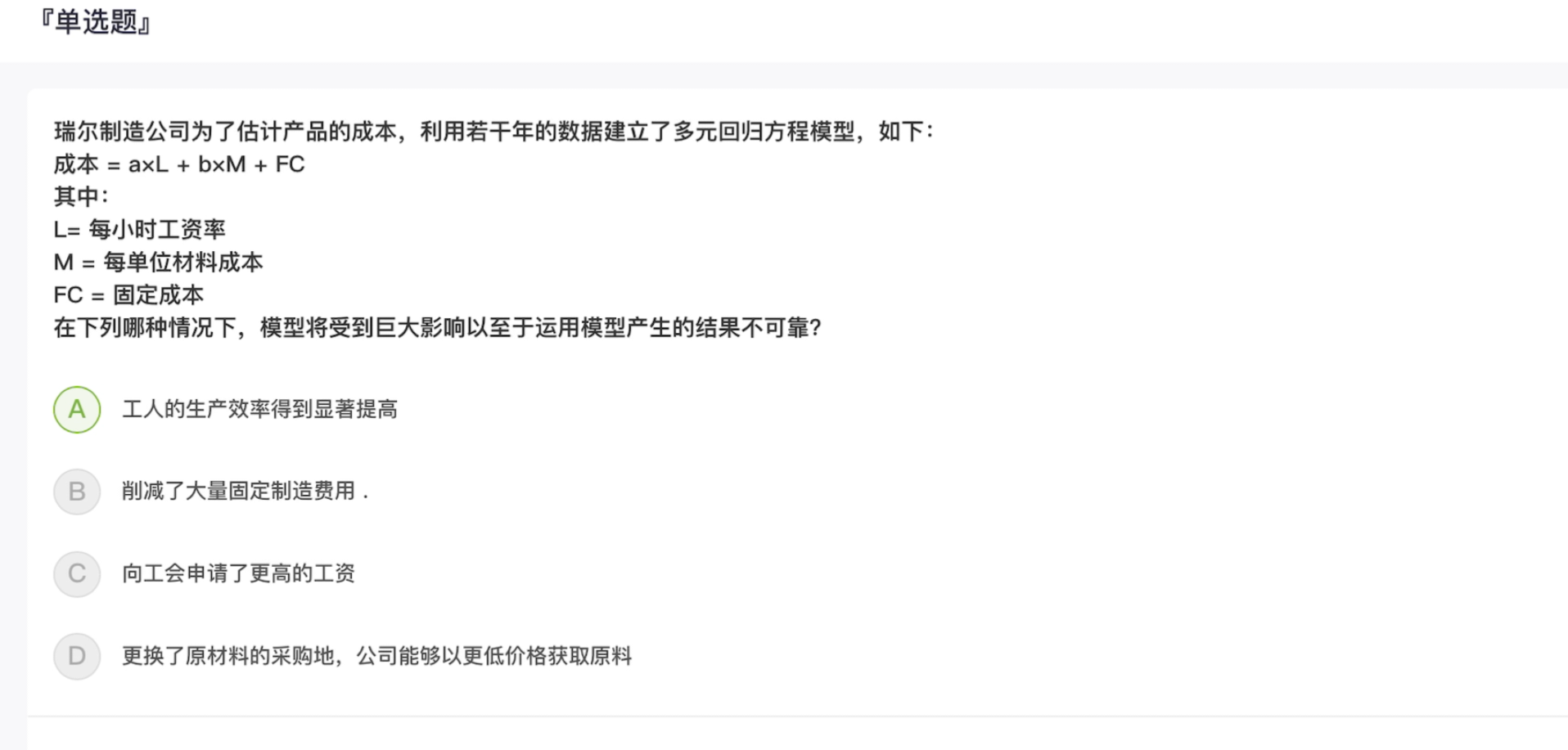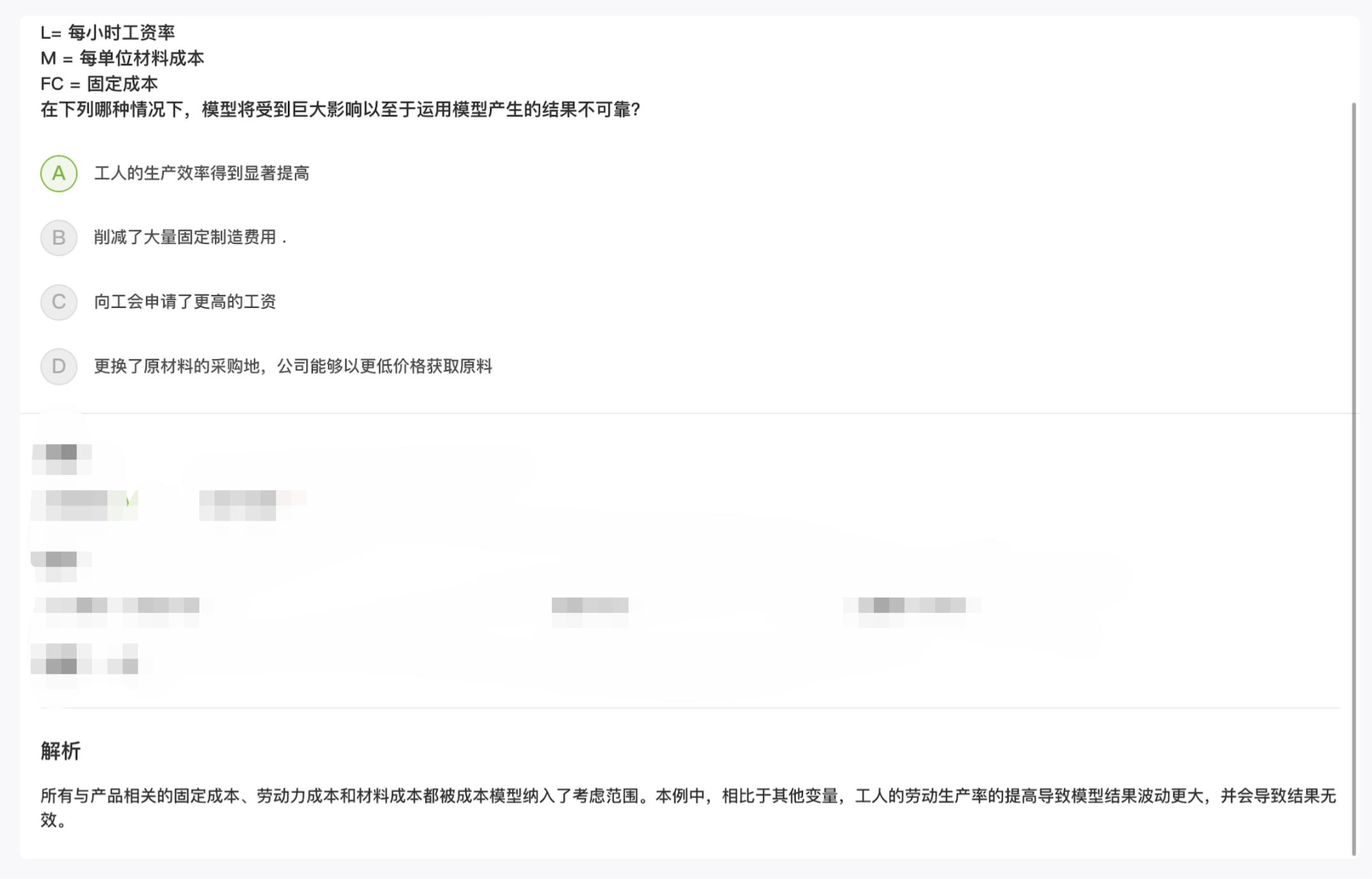 同学你好,在成本模型中,所有的固定成本、劳动力成本和原材料成本认为与产品是相关联的。只有单一变量才可以衡量对模型的影响。其他三个选项,削减大量固定制造费用,可能影响FC,更换了原材料的采购地,材料成本大幅下降,会影响M,向工会申请更高工资的问题,会影响L。而劳动生产率的变化会影响多个要素的变化,所以使模型无效,也就是说生产效率的提高影响的不仅仅是b×M。