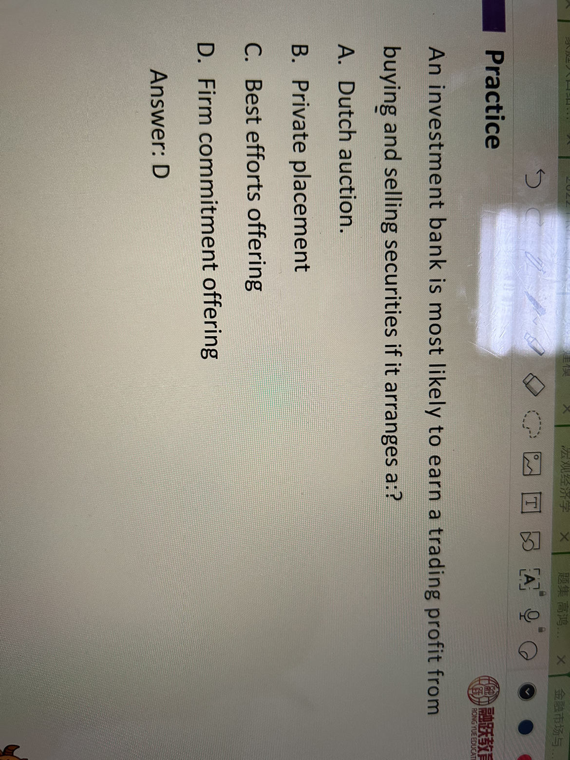 同学你好,A选项是荷兰式拍卖,这是确定IPO的定价方式之一,并不能通过这种方式进行交易获利;B选项是私募,也是证券发行方式的一种,跟荷兰式拍卖这种公开放行不同,私募是针对特定部分高净值客户为发行群体进行定向发行;C选项是尽最大努力发行,也就是代销,只收一个代销手续费;D选项是包销,即承销商先从发行人手里把所发行的证券低价全部买下来,然后在高价卖给投资者,从中赚取差价获取利润,所以最符合题干要求。