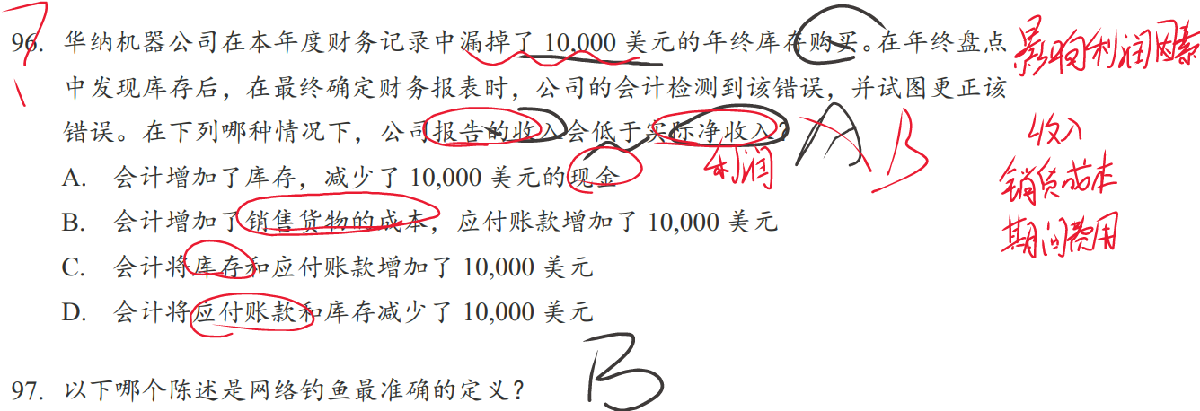 同学你好,B选项:选项意思是,购买的这个产品且销售,那直接补一个分录 借:营业成本 贷:应付账款。那我们来看哈,由题干可知本来少的分录应该为 (1)借:存货 贷:应付账款。假设这些存货全部销售,销售分录应该为 (2)借:营业收入 贷:银行存款(应收账款) (3)借:营业成本 贷:存货。由(1)与(3)的分录可以得出来选项B的分录,但你看,分录(2),选项没有写,这笔分录会增加净利润,所以会造成实际净利润大于报告净利润。其余选项:A选项分录:借:存货 贷:库存现金 ,不涉及损益;C选项分录:借:存货 贷:应付账款,不涉及损益;D选项分录:借:应付账款 贷:存货 分录不涉及损益,且这个分录是题干信息有些不符。