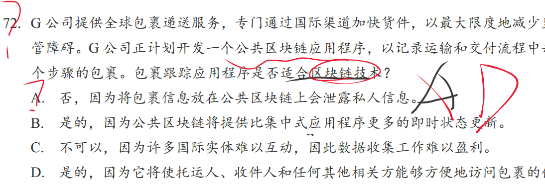 同学你好,首先看题干中建造的目的是”以记录运输和交付流程中每个步骤的包裹“,A选项:公共区块链,任何人都可以访问和参与网络,不受地域或其他因素限制。用户可以互相发送交易,检查账本上的记录,并成为验证者。由于任何人都可以自由访问公链,而无需提交了解你的客户文件或确认(或透露)他们的身份,用户在这些网络中有更强的(伪)匿名性。你可以联想一下咱在日常中查快件信息,只是看到物流信息,包裹在哪个位置,看不到更多的信息,一般不牵扯更多私密信息。但公共区块链私密性确实不是很高,私人信息一般是在私有区块链上,A选项也有道理,只是相对而言D选项更符合题意,更满足题干提出的建造目的以及是否可以完成。
