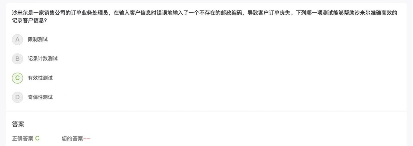 同学你好,[1]最近您问的题目是融跃官网上的吗?我们接到的通知是非融跃题库里面的题目不作答,因为我们没有题目与答案,不能保证准确性。[2](1)限制测试:一般是指有权限才可以使用。(2)有效性测试将数据与主文件比较以便精确记录。不正确数据(例如,一个不存在的邮政编码)当时可以被发现。(3)记录计数测试:通过计算输入记录的个数来检查凭证是否重复输入或遗漏 。(4)奇偶性测试:也称为奇偶校验码,是一种校验码,它用来检测数据传输过程中是否发生错误,是众多校验码中最为简单的一种。