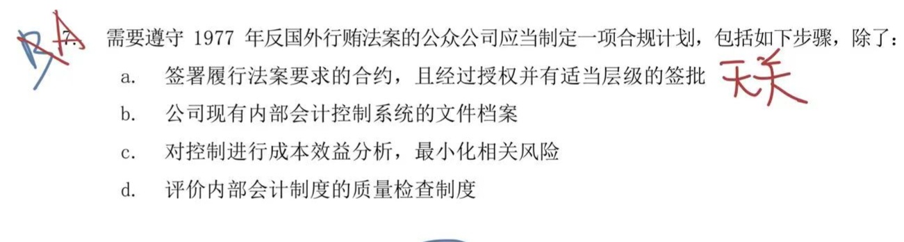 同学你好,这个需要查看 反国外行贿法案的内容。A选项:1977年反国外行贿法案并没有要求公众公司签署履行法案要求的合约,而是国家直接制定,相关人员必须遵守。该法案适用于任何个人、公司、官员、董事、雇员、企业代理人或者任何代表公司行事的股东。如果个人或公司命令、授权或协助他人违反反贿赂条款,该个人或公司将受到惩罚。1977年法案中,除了那些有资格作为发行人的企业外,该法的适用范围并不包括外国公司和外国自然人。如果公司不履行法案要求,公司将被判罚2 000 000美元,对责任人处以5年以下有期徒刑 。