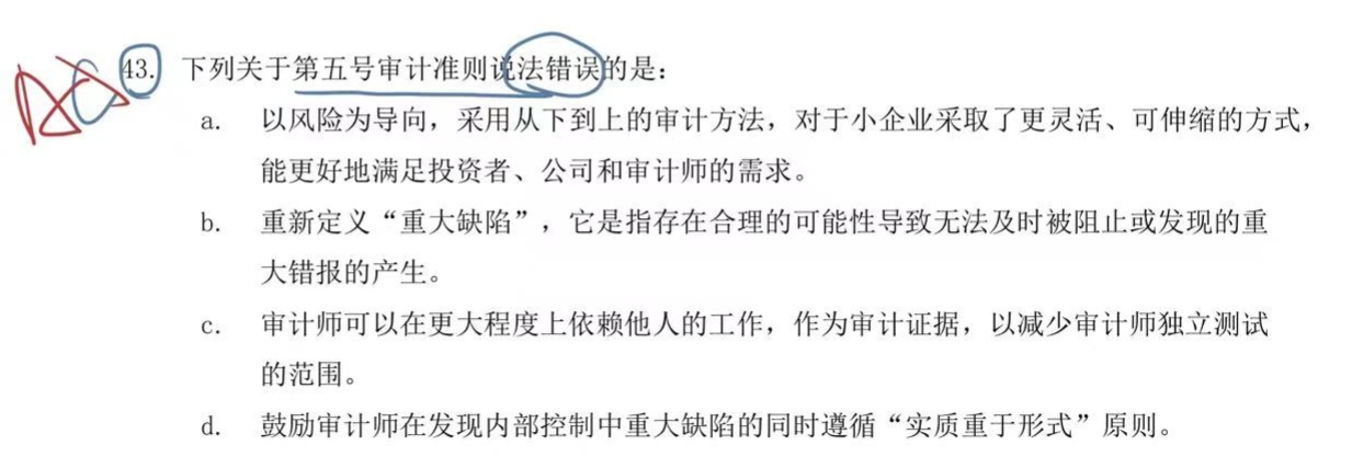 同学你好,(1)审计准则5号条款要求,审计人员按照自上而下的风险评估(TDRA)方法,所以A选项错误。C选项:审计人员通过TDRA方法,确定公司层面的内部控制是否可以充分的控制风险;确定哪些基于交易的控制可以弥补公司层面的控制失效。基于上述两个情况进行评估后,可以确定搜集证据的多少与有效性,和完成内部控制评价的性质、范围和所需要的测试时间。如果得出企业内控整体有效,可以在执行审计工作的时候,设置一个较高的重要性水平,是可以借助他们工作,减少审计师的审计范围。(2)但在依赖他们工作内容的时候,一个是外部专家的意见。一个是企业内部的证据,使用内部证据的时候,一定要谨慎使用,需要确定内部控制是有效的。