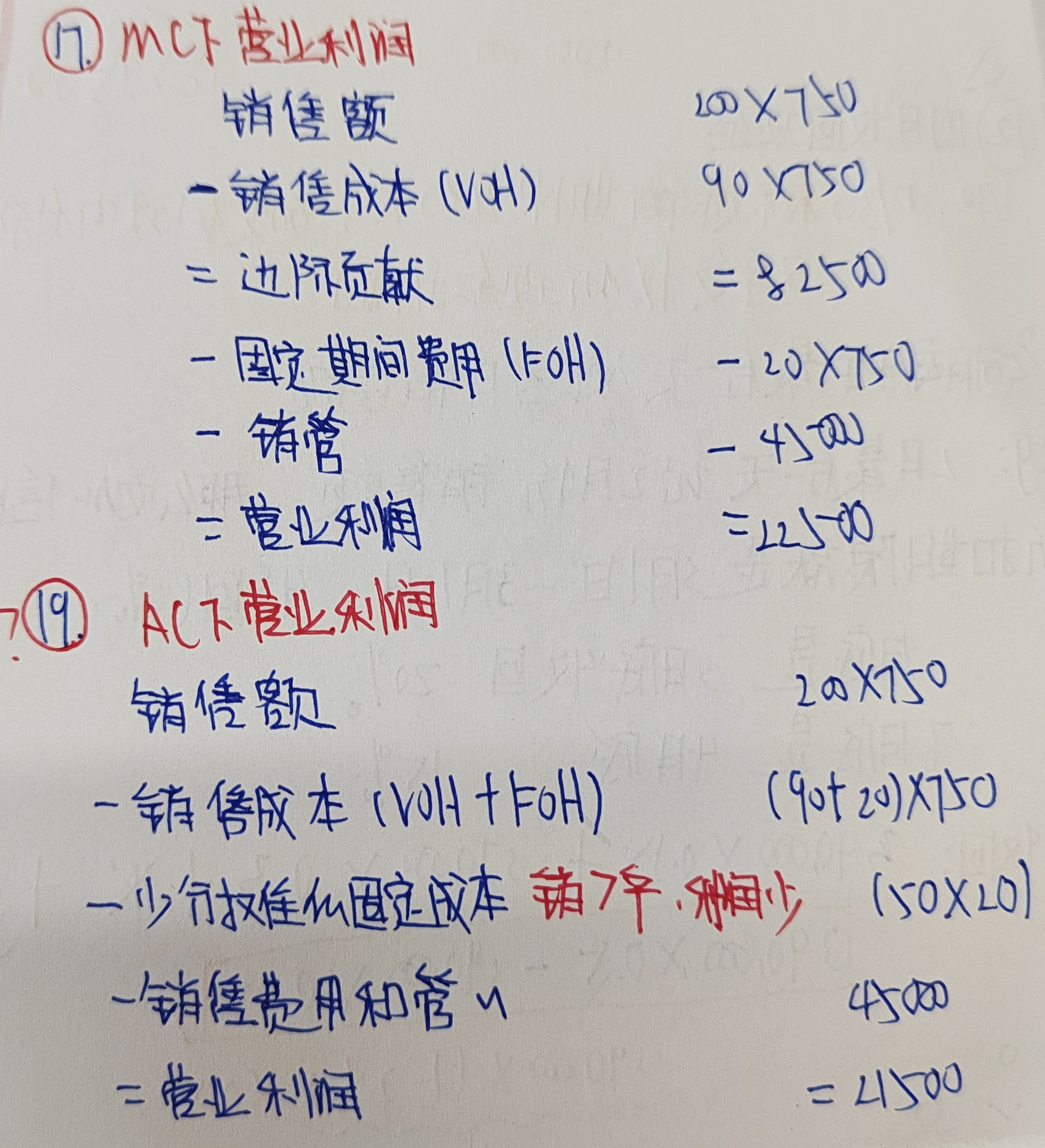 同学你好,当期间生产量不等于销售量时,“变动成本法”和“吸收成本法”下会产生不同的净利润。当产量多于销售量的时候,则吸收成本法将有更高的净利润,因为存货中吸收了部分固定制造费用,当销售量大于产量的时候,则变动成本法将会有更高的净利润。比如这一道题目中,变动成本法的固定制造费用=750×20=15000,全部记在当期。但是吸收成本法下期末存货(未销售部分)也吸收一部分固定制造费用,本期销售750大于本期生产700,所以本期销售部分存货的固定制造费用分为两部分:(1)第一部分:本期生产700产量实际消耗的=750×20=15000.(2)第二部分:销售期初存货50含有的固定制造费用=50×20=1000。所以如果只计算本期实际耗用的固定制造费用的话,完全成本法还有50单位存货里面含带的固定制造费用未分摊。