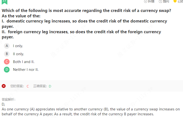 同学你好,首先要明白信用风险是在你获利的时候会发生,也就是作为未来现金流的流入方,所以不管是贬值还是升值,一定是收现金流的一方会面临信用风险(因为万一对方到期不给钱或者由于贬值给的少了),所以由此判断两个说法都不对,这是比较粗糙的判断方法;针对这道题,具体来说就是如果未来收到的货币升值了,就意味着对于对方来说给出的更多,对方违约的概率就会增加,所以你就会面临信用风险,反之,如果你未来收到的货币贬值了,那么就意味着你付出去的钱升值了,所以你违约的概率增加了,结果就是对方的信用风险增加了。