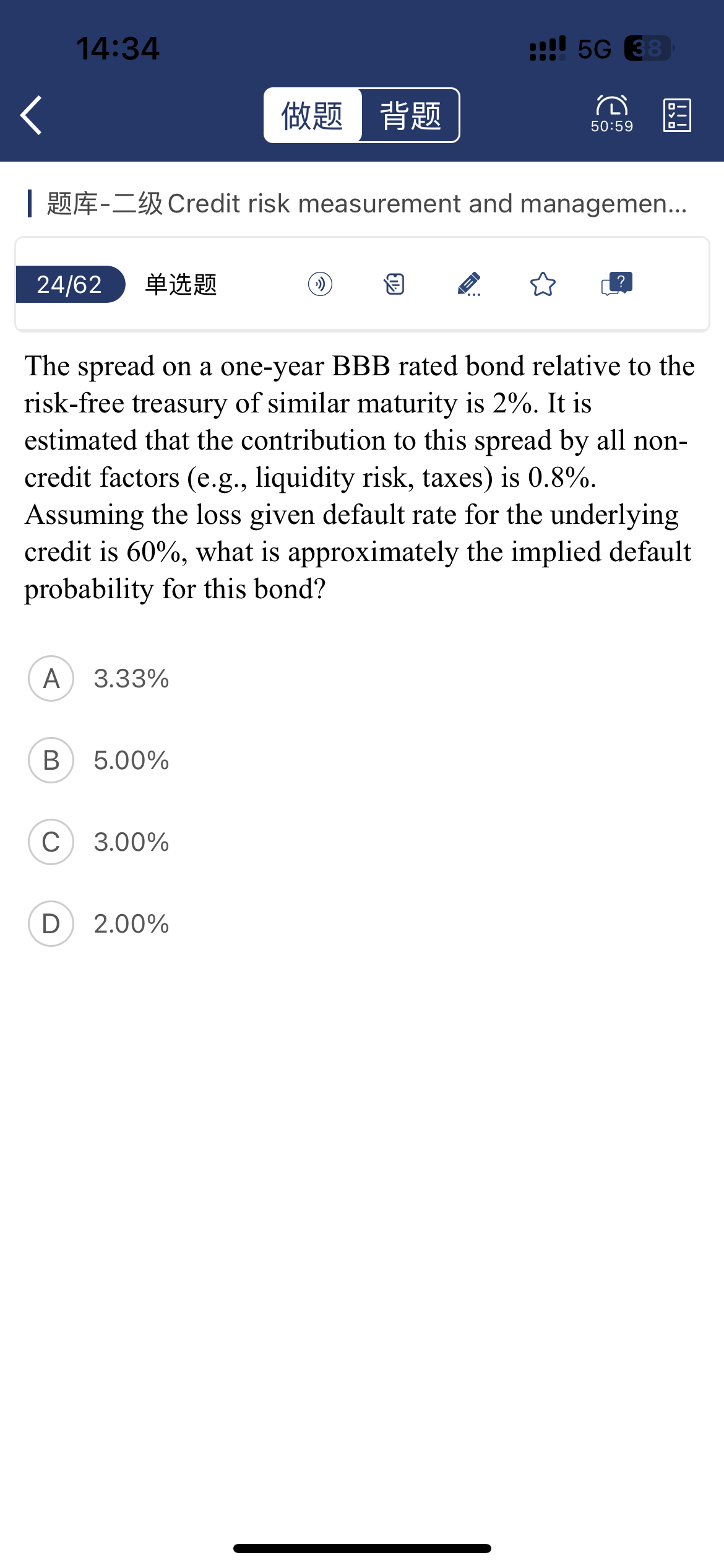 同学你好,这道题考察的就是对公式Credit spread=PD*LGD的运用,只不过这里面没有直接给出Credit spread,而是通过总的spread减去non-credit spread算出来。