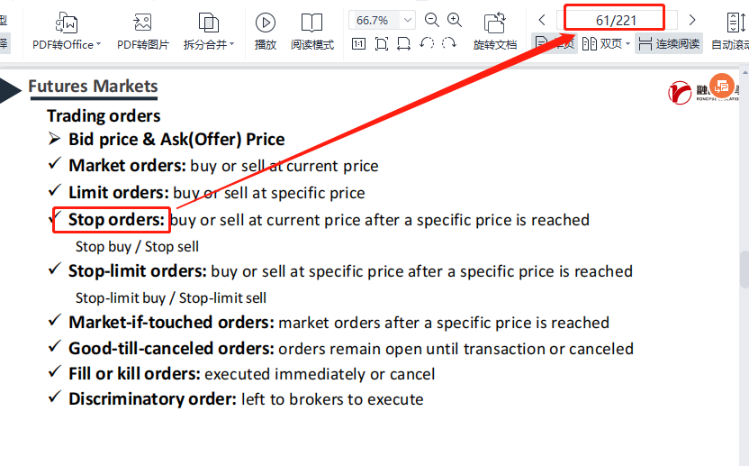 同学你好,自行裁定指令(discretionary order)或不为市场所限指令(market-not-held order,课件上没有单独讲,了解即可)是一种市场指令,但是这种市场指令允许经纪人自行决定延迟交易以便得到更好的价格。Stop order就是stop-loss order,即止损指令的意思,具体位置参考图片,另外同学如果想快速找到某个概念具体在课件什么位置,可以用Ctrl+F 查找功能进行查找。