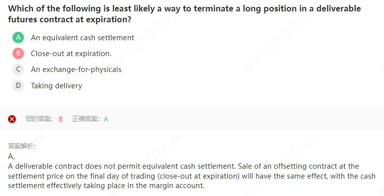 同学你好,这道题问的是对于一个到期的期货合约的多头,哪个选项最不可能是其交割方式,一般交割方式有现金交割,即直接反向平仓(B选项)和实物交割,即期货转现货交割(C选项)、直接现货交割(D选项);不能通过等额现金交割,注意反向平仓属于净额结算,并不是等额现金交割,所以A错误。