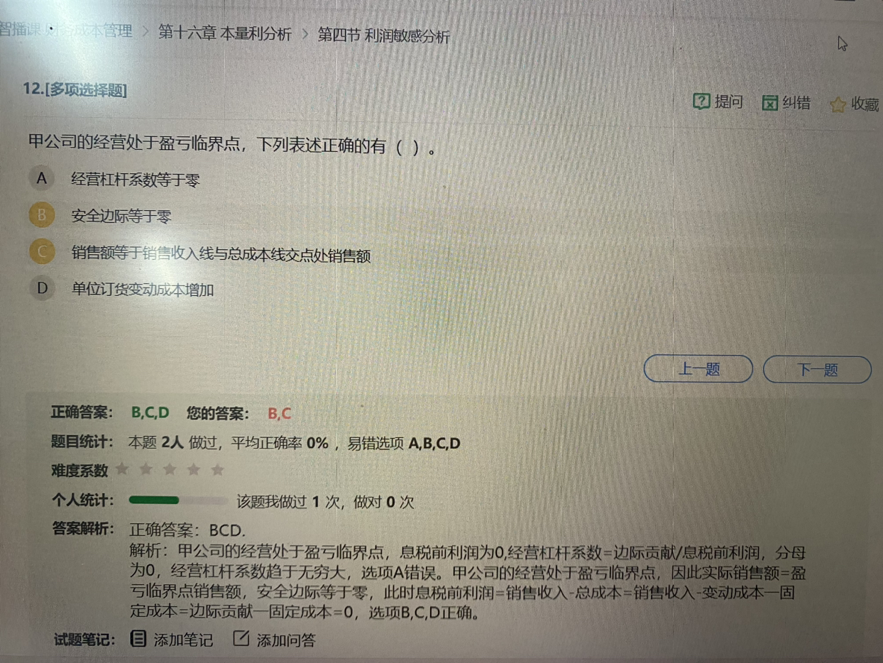 经核查原始题库文档,D选项应为:边际贡献等于固定成本,属于上传失误