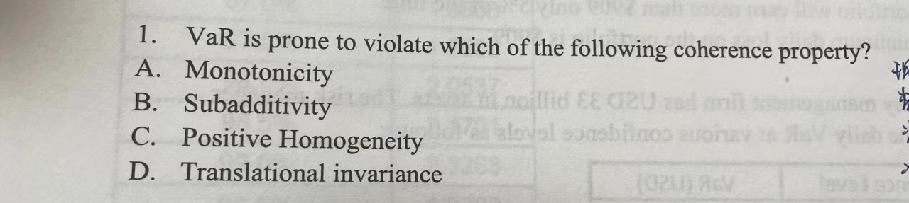 同学你好,只需要掌握次可加性的定义即可,即组合资产的VAR值是小于等于单个资产VAR之和,说明了组合分散化可以降低总体损失,至于VAR为什么不符合次可加性的证明过程不需要掌握,另外,VAR并非完全不满足次可加性,VAR在正态分布和椭圆分布条件下是满足次可加性的,记住结论即可;monotonicity指现金流越大风险越小的意思是说优质资产(现金流比较好,对于股票而言就是分红多的股票更优质,风险也更小)的风险更小,从定性方面理解即可。