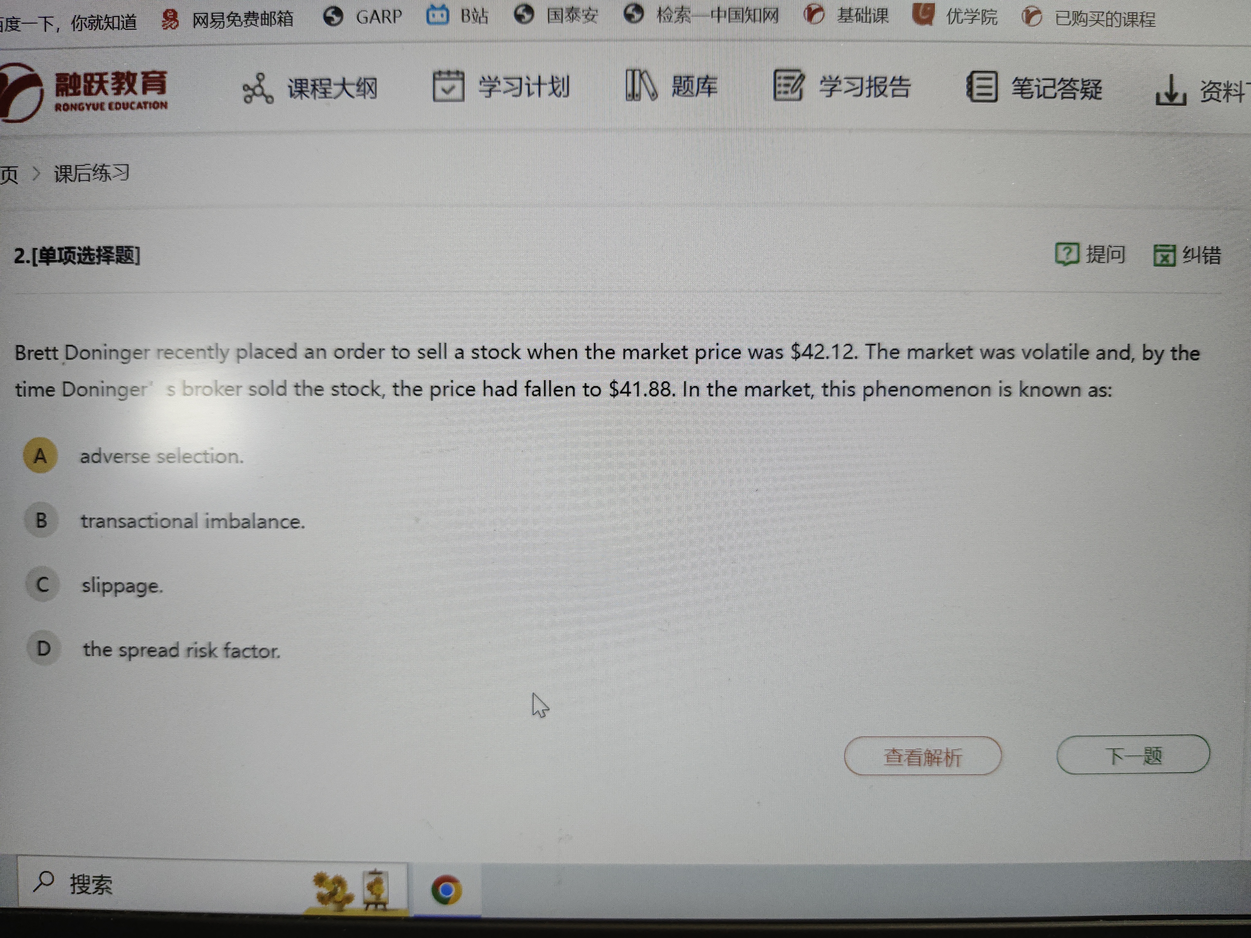 这道题答案选C,slippage即价格滑动的意思,是流动性风险的一种表现,了解即可。