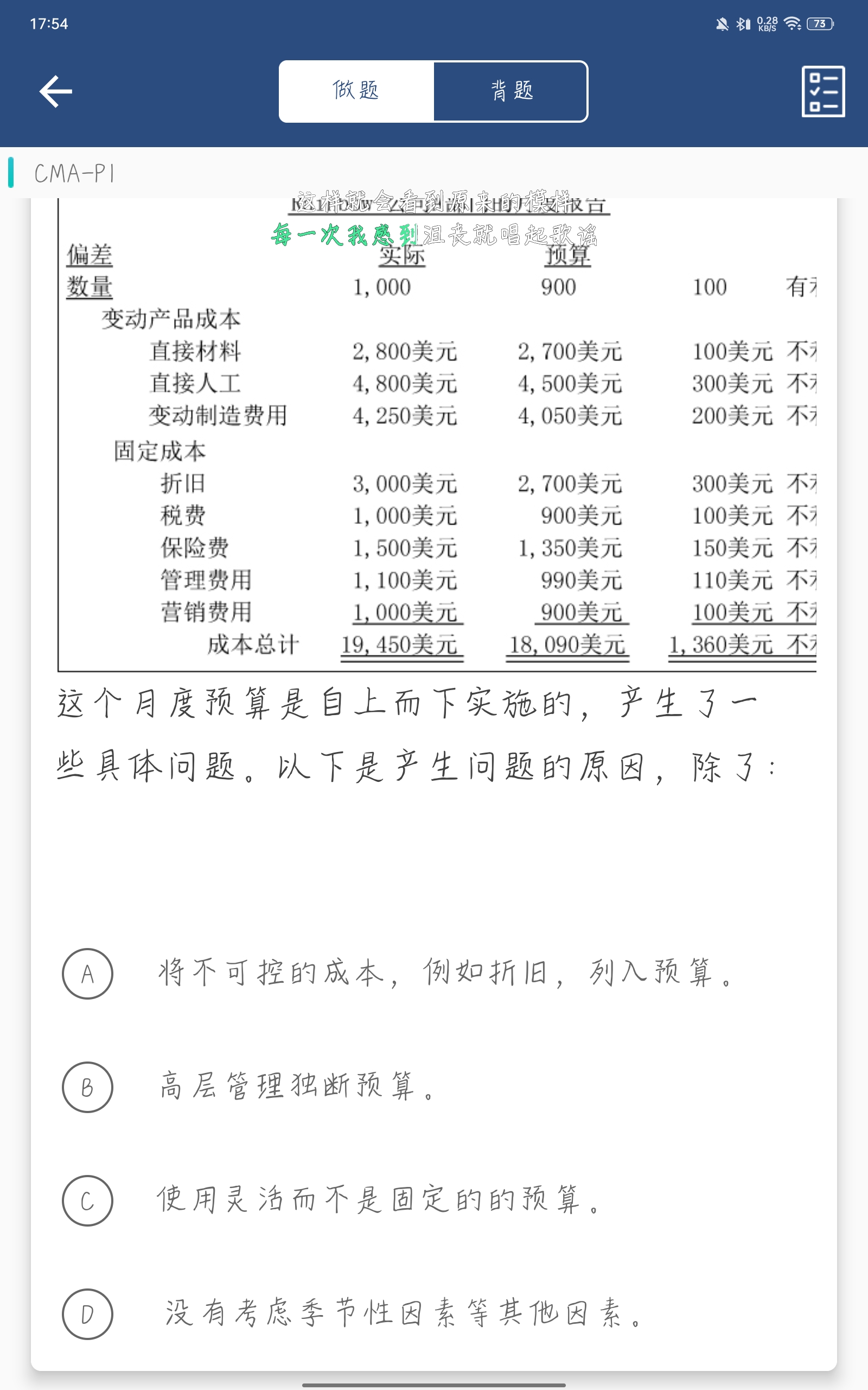 同学你好,首先我们先来看一下题目:这个月度预算是自上而下实施的,产生了一些具体问题。那我们提取到的信息就是权威式预算的特点是什么?有哪些缺点?自上而下的权威式预算会整体把控,从战略层面进行。但是高层独断预算,相应就会缺少灵活,所以选C选项。D选项:正因为是整体把控,所以会考虑季节变化,相应的在编制月度预算的时候也会进行相应的调整,比如:淡旺季之分,在淡季的时候,预算额就是少一些。旺季的时候,预算额就会多一些。你的这句话 ”一个月的月度怎么反应季度变化“,也许是把逻辑顺序整反了,是考虑了季节性变化,所以会反应在月度预算上,所以这个不会是产生问题的原因。