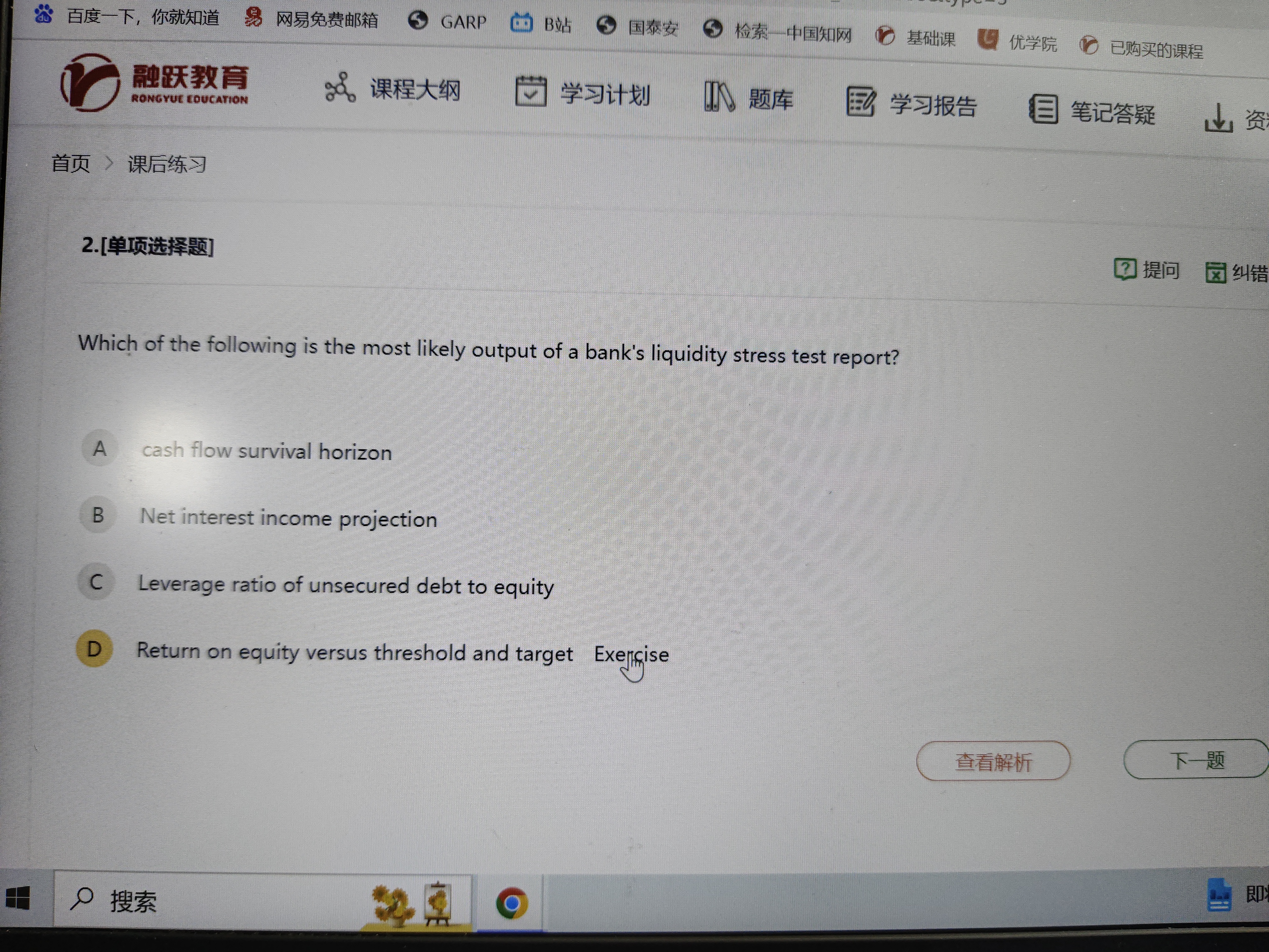 同学你好,流动性压力测试报告的目的是为了知道我的流动性还能支持多久(关于流动性本身),而不是有关收益(B和D选项)和杠杆指标(C选项),所以只能选A。