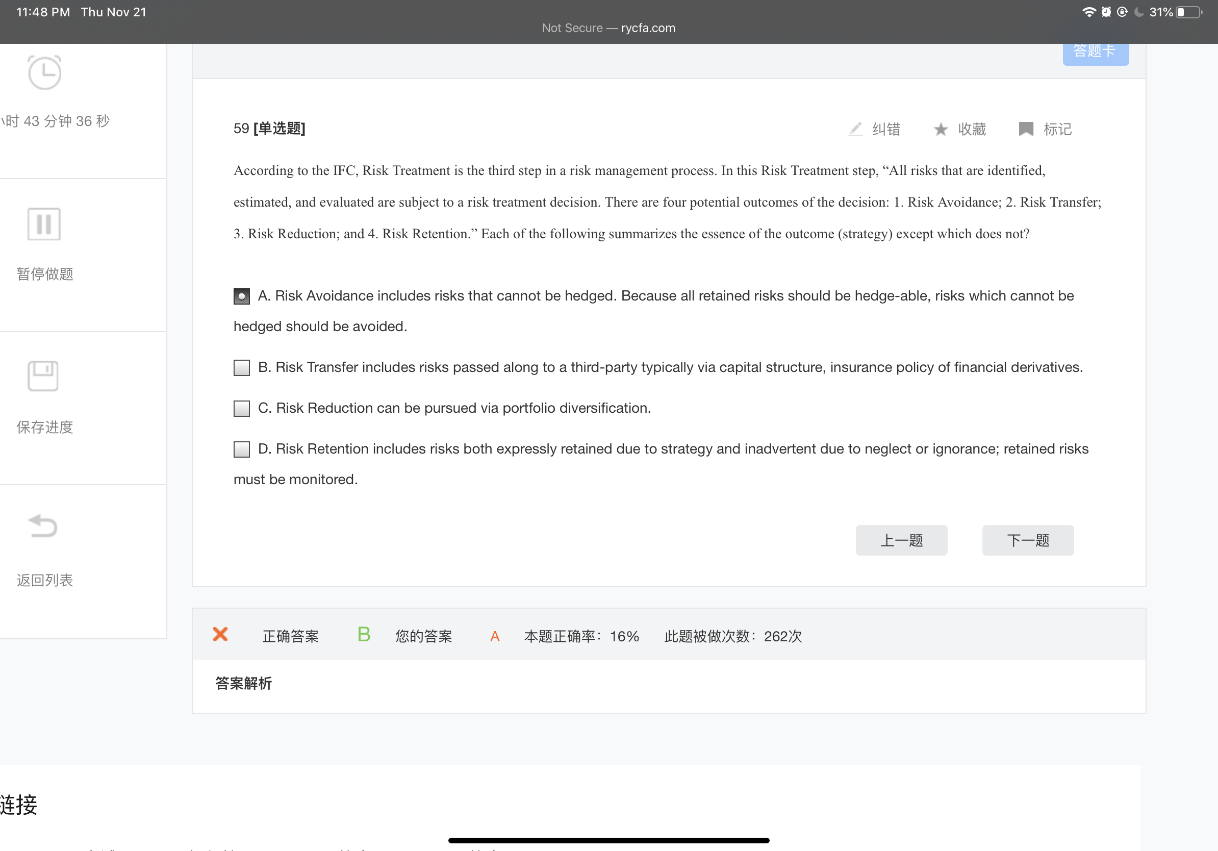 A选项说的是,风险避免应该包括那些不能够对冲的风险,因为存在的风险都应该可以被对冲,不能够对冲的风险应该要避免 B选项,保险和CDS是transfer (转移),衍生品是diversify (分散化)