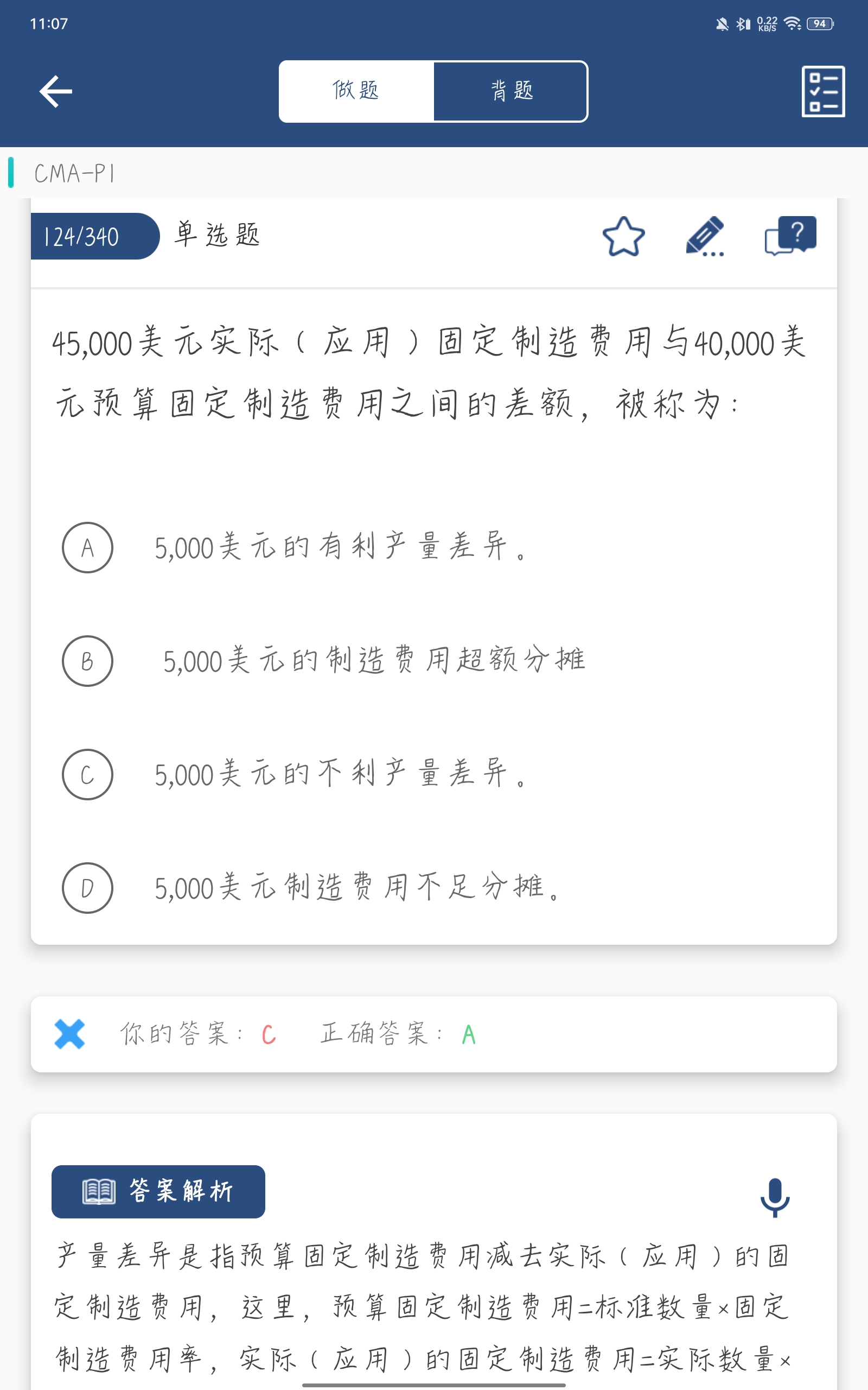 同学你好,(1)固定间接费用产量差异=预算的固定间接费用-分摊的固定间接费用,正数(U),代表不利差异:负数(F),代表有利差异。在题目里面预算的固定制造费用40000-实际分摊后固定制造费用45000=-5000,有利差异。(2)固定制造费用的产量差异是预算值-基于实际产量的分摊值。即(SQ-AQ)SP,当SQ*SP小于AQ*SP,说明实际产量高于预算产量,也就是说相同固定制造费用下,生产了更多的产品,所以是有利差异,反之,当SQ*SP小于AQ*SP,即SQ小于AQ,说明相同制造费用下,实际产量低于预算产量,是不利差异。固定制造费用的产量差异的有利差异和不利差异,要与原材料的产量差异区分开来。对于原材料来产量差异来说,SQ大于AQ,是不利差异,反之是有利差异。固定制造费用的产量差异和原材料产量差异的结论是相反的。