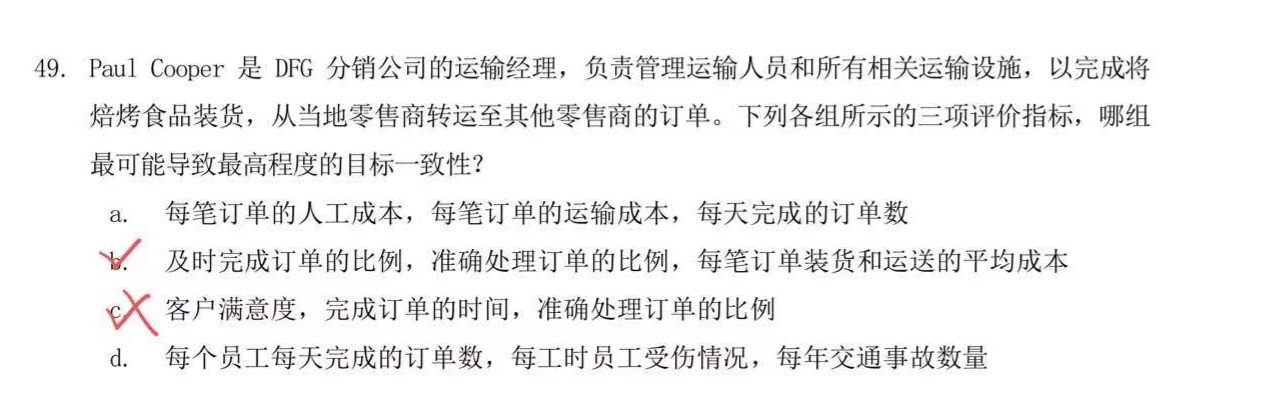 同学你好,首先题目中给出运输经理的职能信息,其次考点是目标一致性。那也就是员工做法与运输经理职能的一致性。运输经理“负责管理员工和有关的运输设备,并填写本地零售商烘焙产品订单及向零售商交付产品。”,并没有提到客户怎么样,所以客户满意度是一个无关的信息。