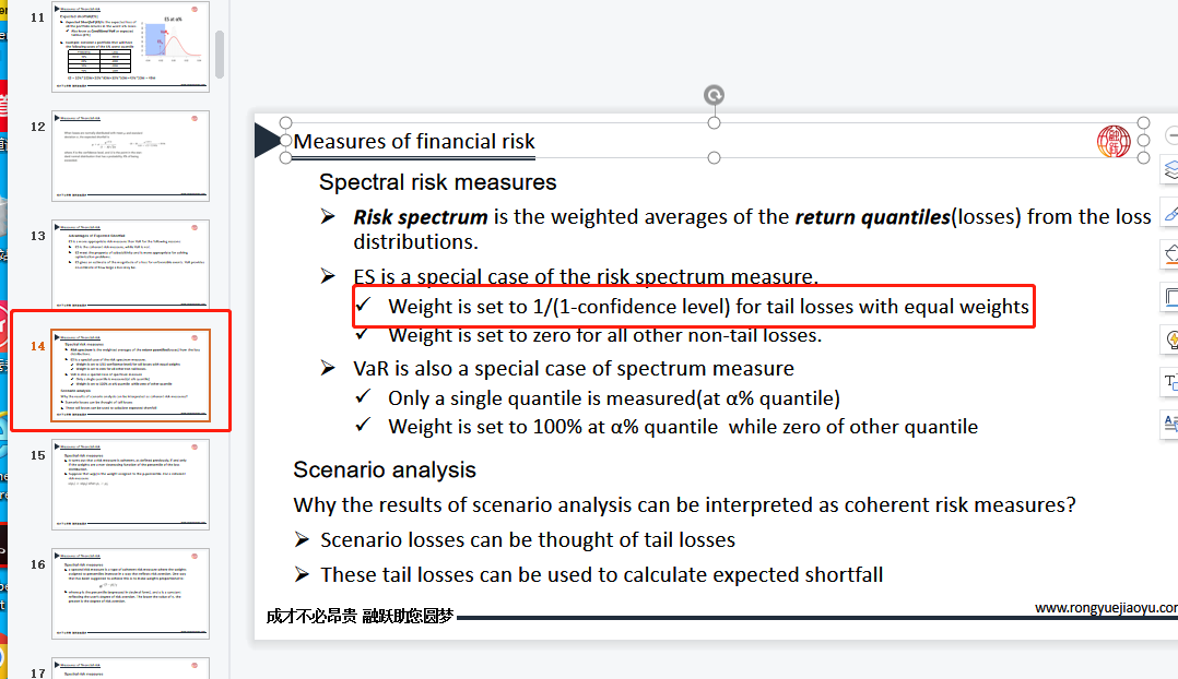 同学你好,这道题考察的是普风险度量下面的ES和VAR的区别,具体位置参考图片(估值与风险模型第基础班课件)