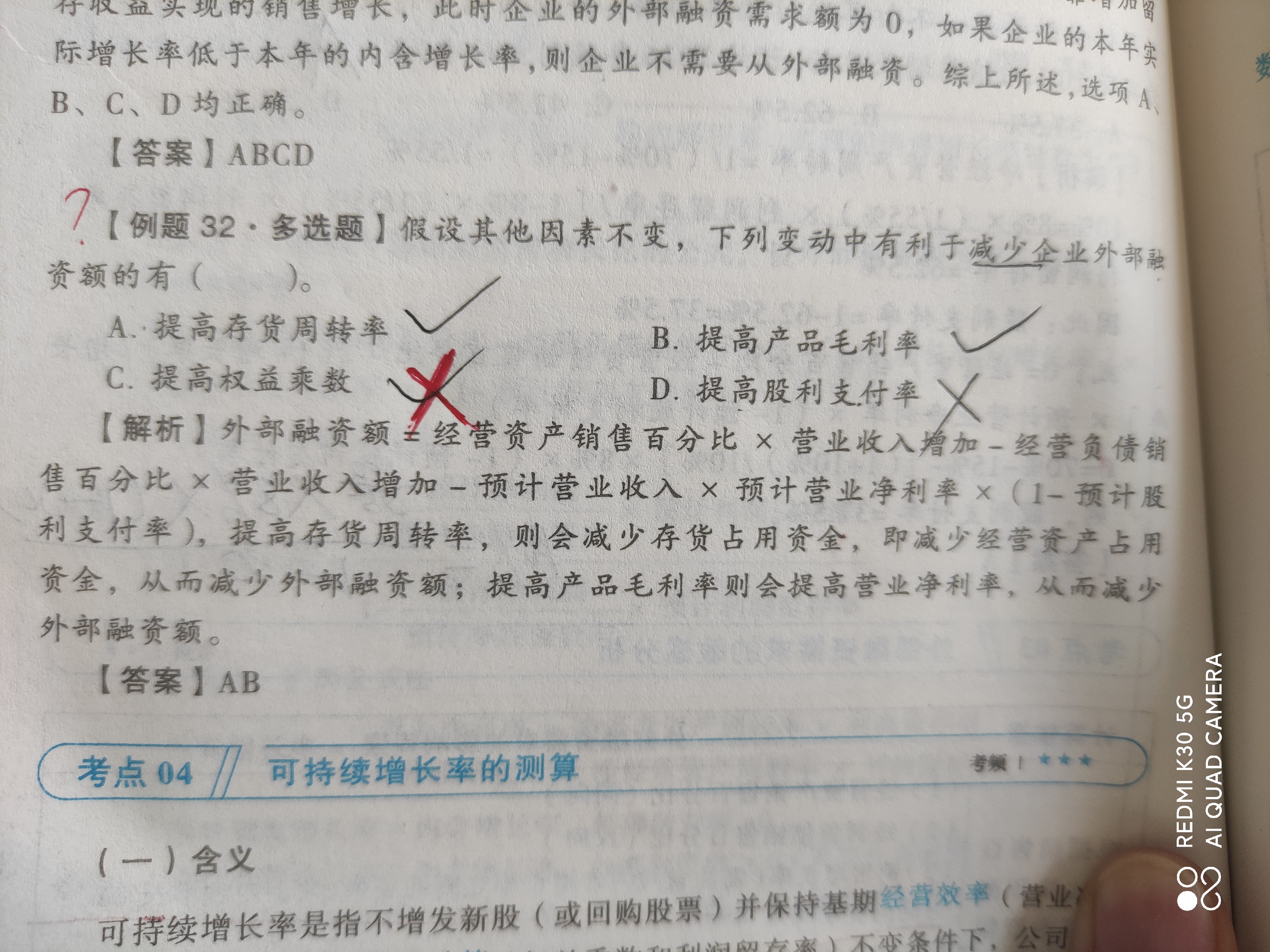 同学您好 外部融资额=经营资产的增加-经营负债的增加-留存收益的增加-可动用的资产,计算公式中并没有涉及到权益乘数,所以提高权益乘数并不会影响外部融资额。