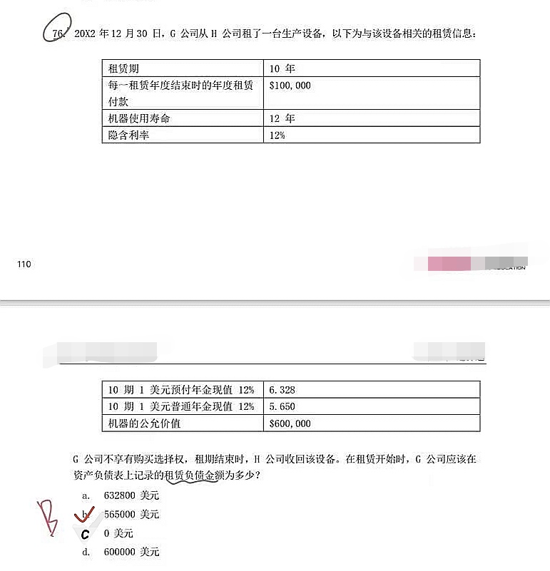 同学你好,(1)由于租金是每年年末支付,把它折现到租赁的时点,所以需要年金现值系数。(2)第二个问题我没有明白这句话,[在资产负债表上记录的租赁负债金额”用的是$100 000],这句是在那里获取到的信息呢?期初租赁负债的金额应该是每年的需要支付的租金乘以年金现值系数。