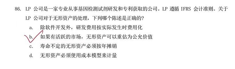 同学你好,(1)这道题目考察的是IFRS与GAAP之间的差异。IFRS对于无形资产:开发成本可以资本化;如果资产交易存在活跃市场,则允许进行重新评估。GAAP对于无形资产:开发成本一般在发生时计入费用;禁止对无形资产进行重新评估。(2)一般按照国内准则,无形资产按照成本计量,B选项是IFRS准则要求,可以根据市场波动,以公允价值对无形资产进行计量。