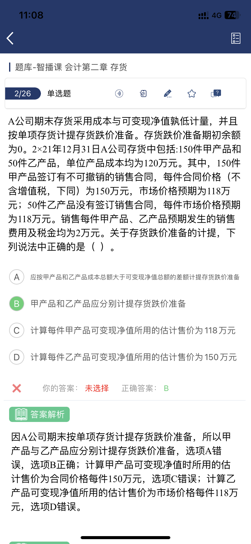 同学您好 甲产品确实没有发生减值,但是B选项依然说法是正确的,B选项的意思并不是在说甲产品和乙产品都发生了减值,而是在说甲乙产品不应混同在一起计提跌价准备