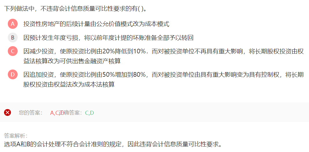 同学您好 您学到第五章投资性房地产的时候,就会知道,公允价值计量不可以转为成本计量这一规定的 坏帐准备是不可以随意进行转回的,AB都属于违背了会计准则,是不被允许的操作哦 CD属于符合可比性原则哦,且符合会计准则的规定的,学到第六章长期股权投资后续计量的时候就会明白不同比例下应如何进行计量 现在不会做或者不明白选项的内容是很正常的现象,不要被第一章吓到,往后学就会更清晰