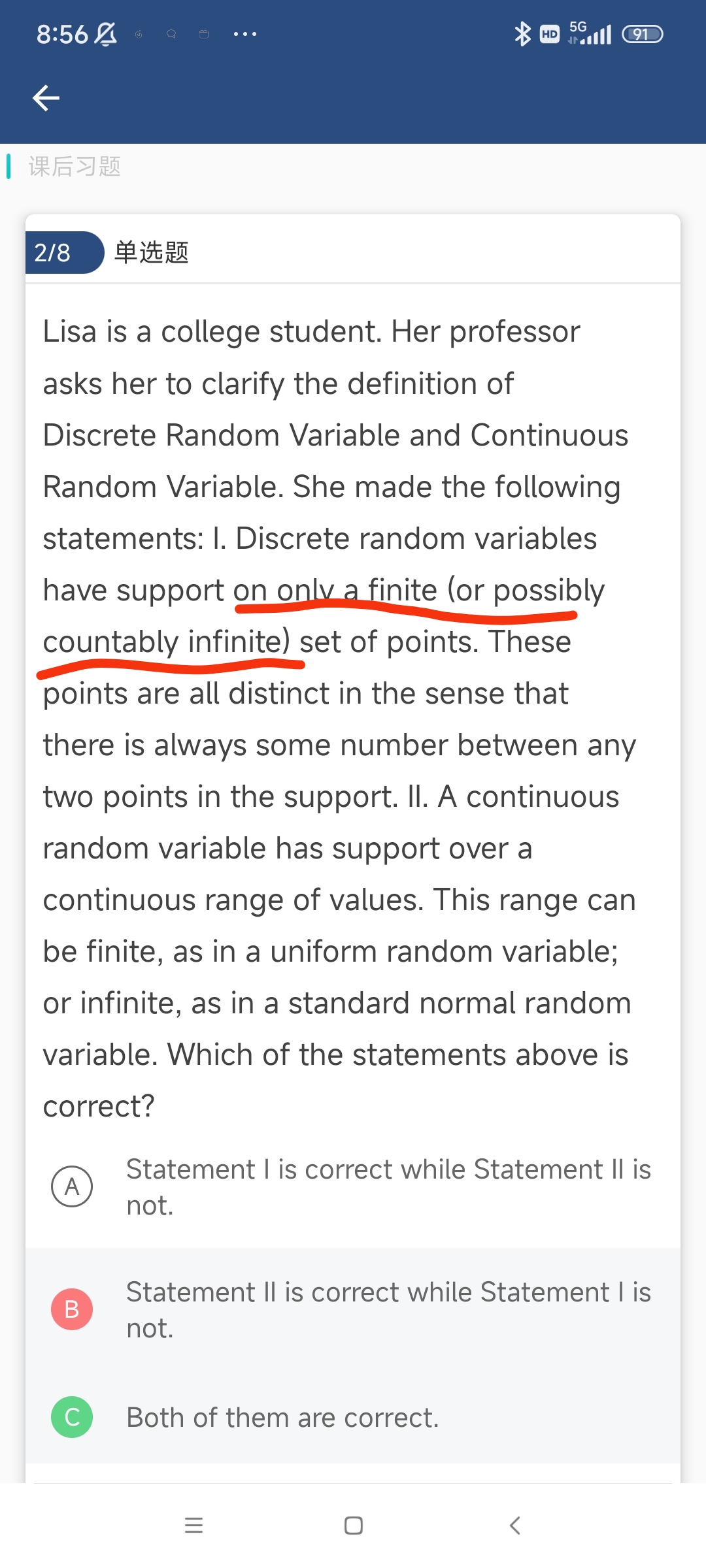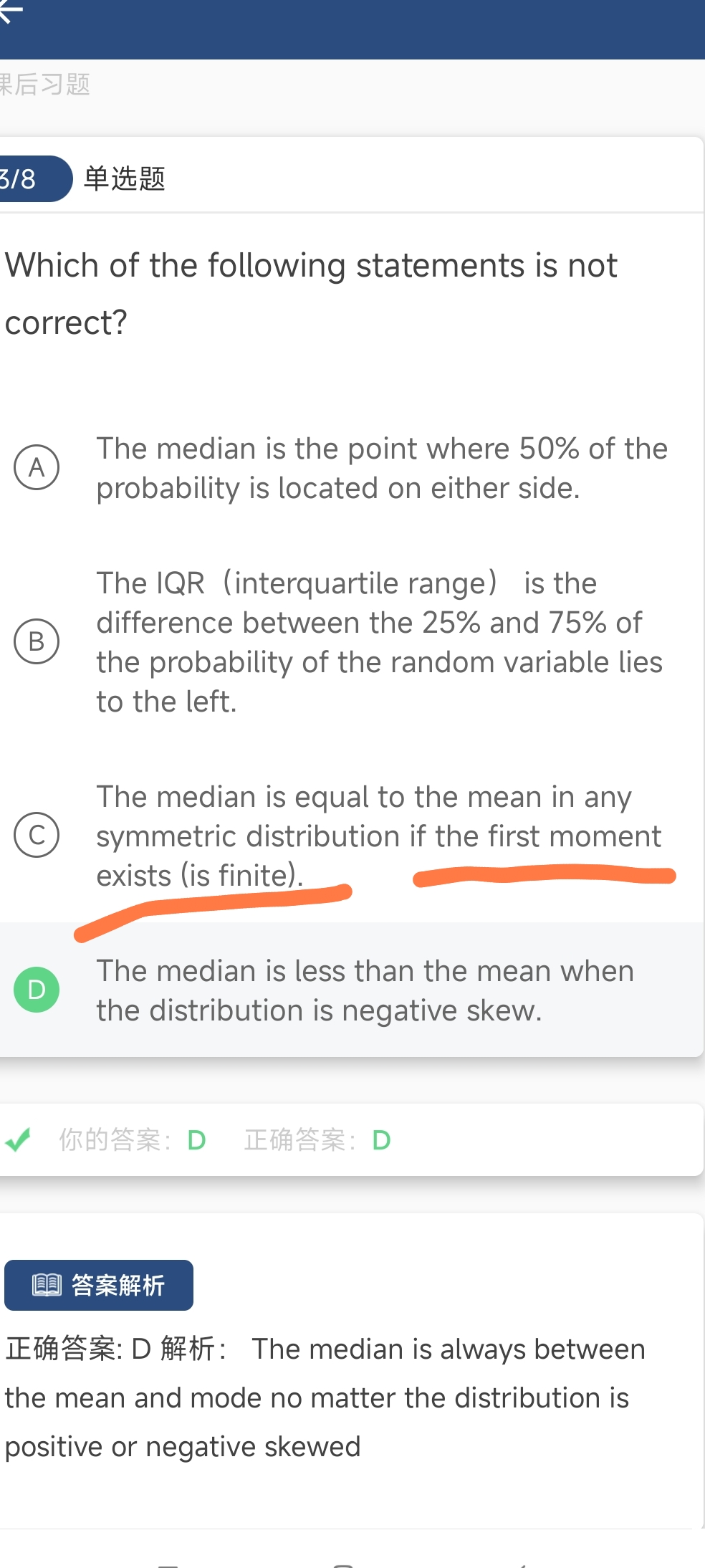 同学你好,第一张图片中first moment exists and is finite的意思是均值存在且有限,跟第二张图片中的离散分布中有限的数据点或者可数无限本质说的是一回事,就是给你一列离散数据,那么肯定能计算出来一个均值,如果给你的是一列有限连续数据,比如区间分布,那么均值也一定可以计算出来,如果是无限的数据但是可数,比如离散分布,也是可以计算出均值的。