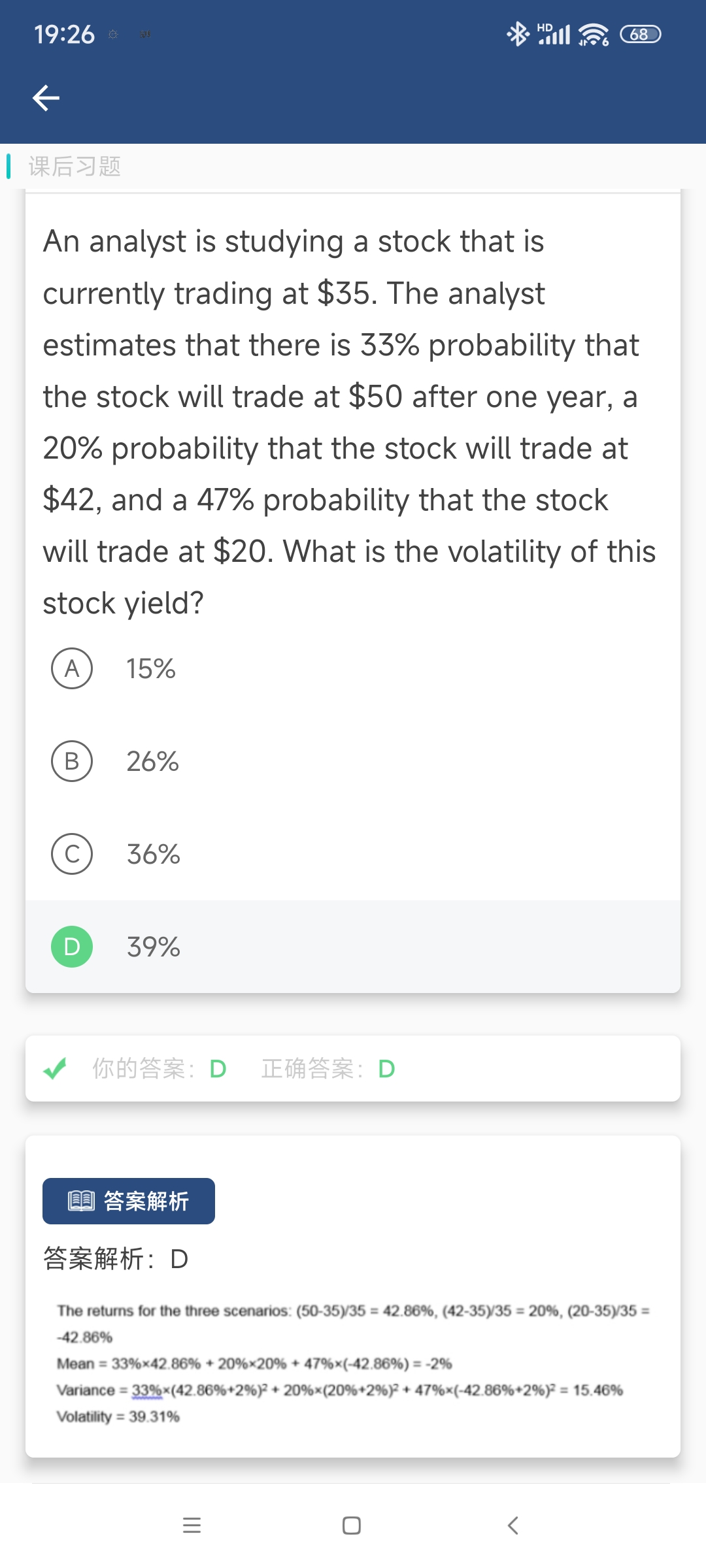 同学你好,这道题让计算的就是股票收益率的方差,收益要根据价格计算出收益率,然后在 利用概率加权平均法计算出收益率的均值,然后再利用概率加权平均代入标准差公式计算出波动率,这道题本质上考察的就是概率加权平均和标准差公式的结合。具体过程就是解析中过程。