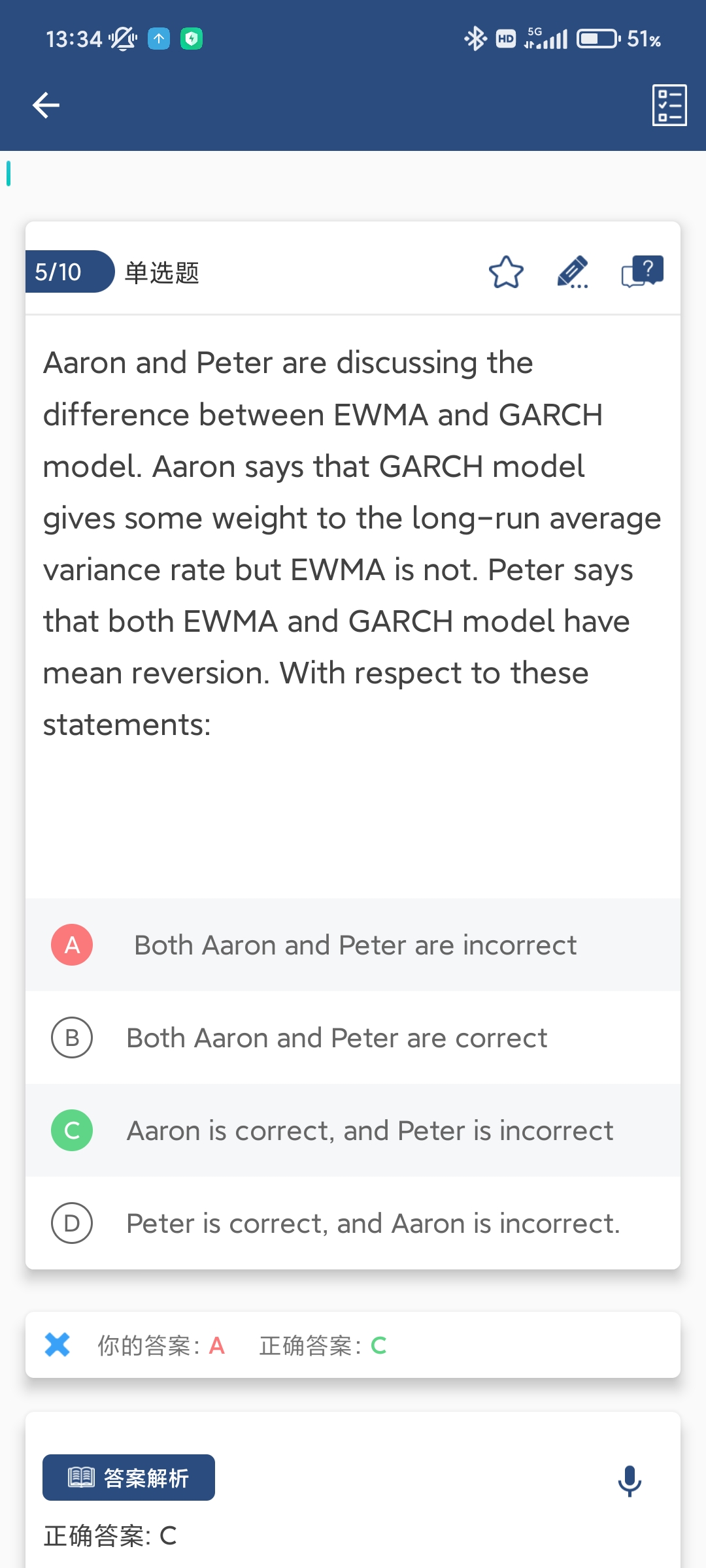 同学你好,Aaron says that GARCH model gives some weight to the long-run average variance rate but EWMA is not的意思是说GARCH模型有给长期平均方差权重,但是EWMA模型没有给长期平均方差权重。