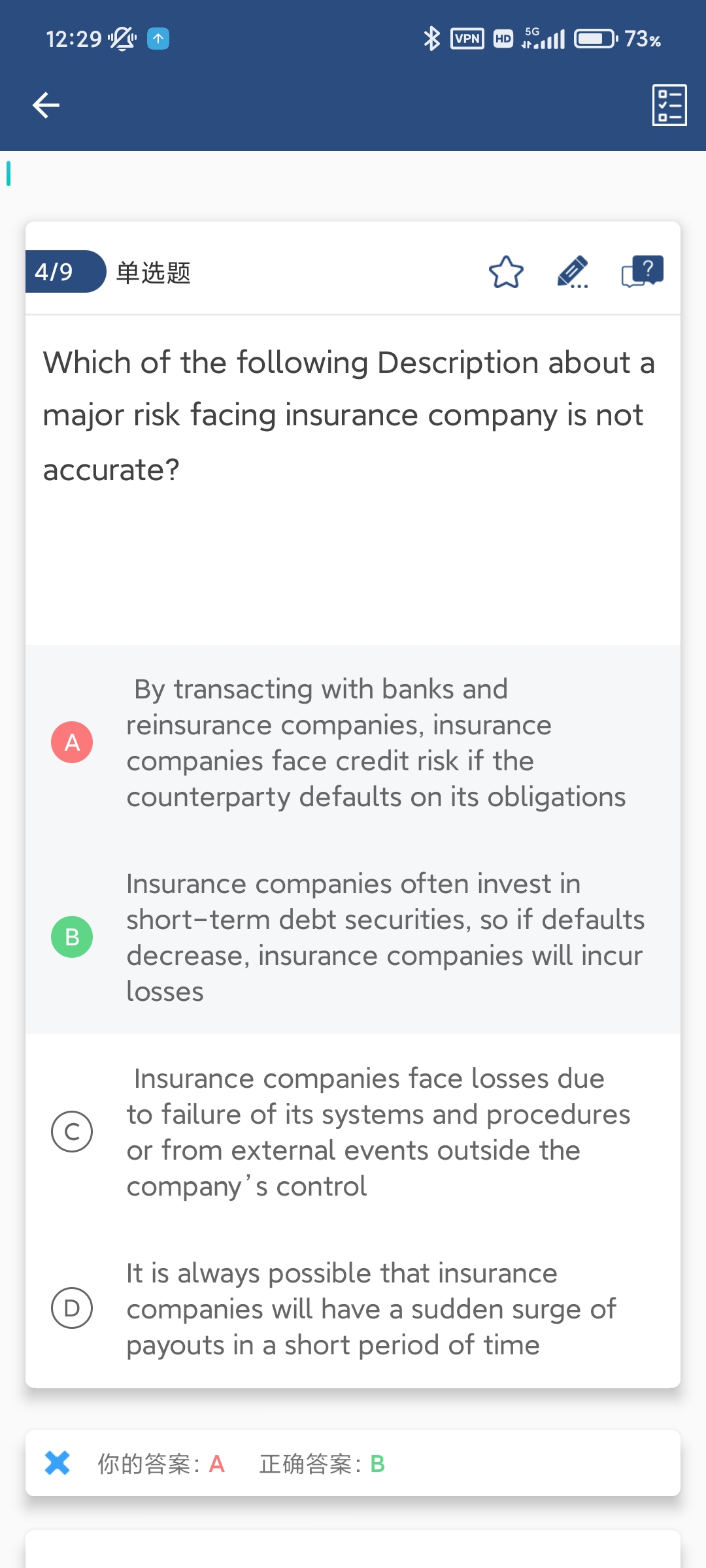 同学你好,这道题是让选不正确的选项,A选项的说法(保险公司与再保险公司签订合约转移风险,假如再保险公司违约,那么保险公司就面临着信用风险)是正确的,所以不选A。