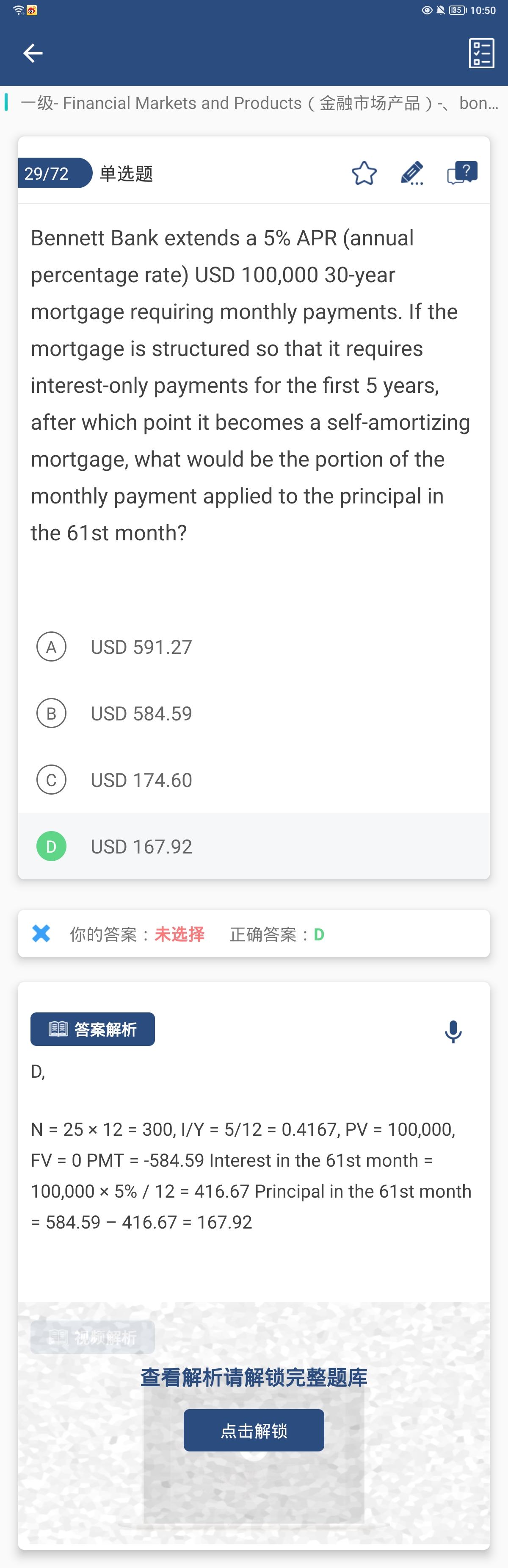 同学你好,题目问的是第61个月偿还的月供当中本金部分金额是多少,那么首先要计算出第61个月月供是多少,然后减去当月支付的利息部分,就是我们要计算的月供当中本金部分金额。那么第61个月的月供该如何计算呢,根据题干信息,前五年只还利息不还本金,从第6年开始(即第61个月开始)按照正常的摊销方法计算月供,所以就可以用正常的月供摊销法计算(即知四求一),由于之前没有还本金,所以第61个月的本金不变就是10万,即PV=-100000,N=25*12=300,,I/Y=5/12=0.4167,FV=0,最后计算出PMT就是月供金额。
